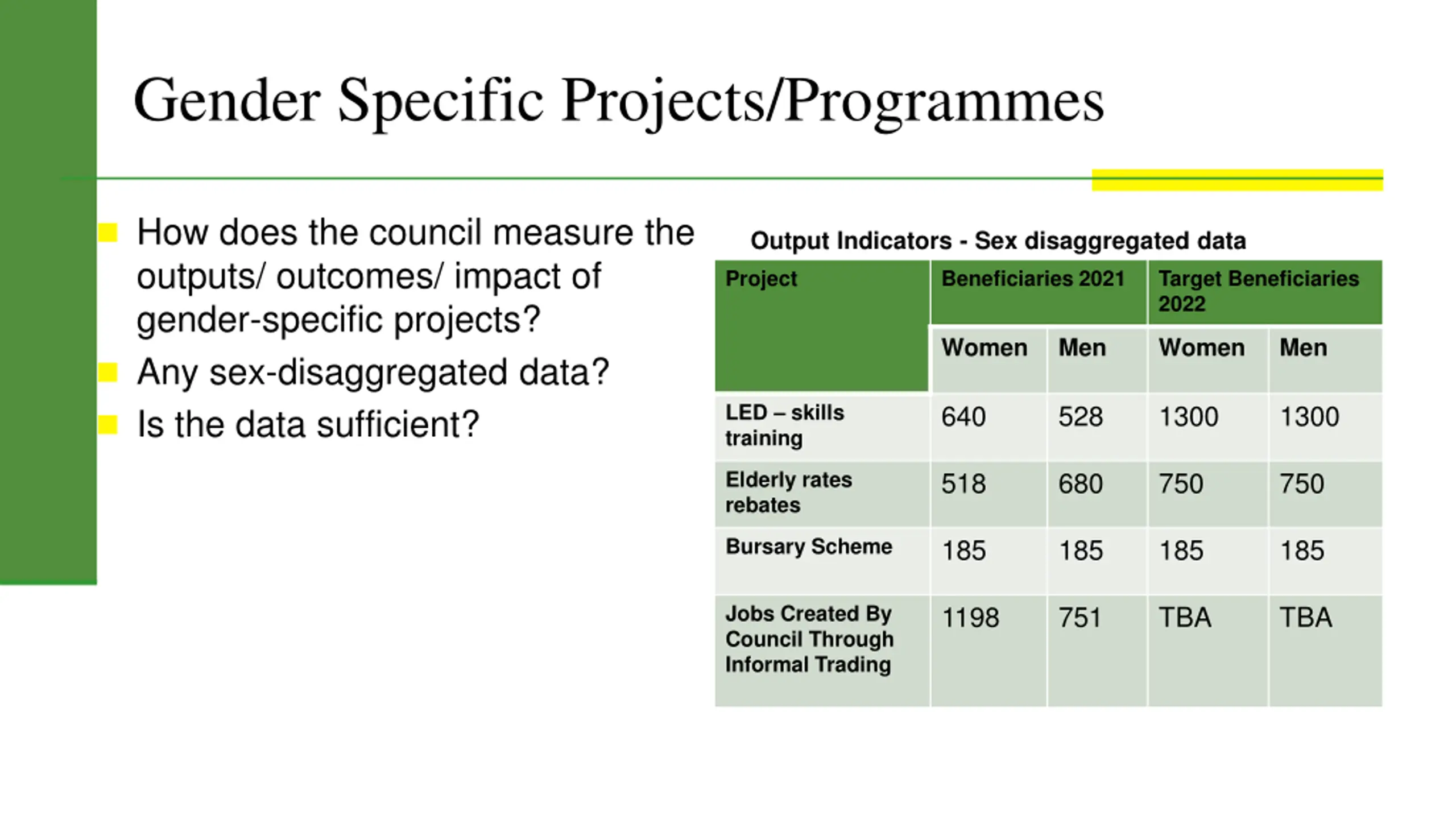 Gender Specific Projects/Programmes How does the council measure the outputs/ outcomes/ impact of gender-specific projects? Any sex-disaggregated data? Is the data sufficient? Output Indicators - Sex disaggregated data Project Beneficiaries 2021 Target Beneficiaries 2022 Women Men Women Men LED skills training 640 528 1300 1300 Elderly rates rebates 518 680 750 750 Bursary Scheme 185 185 185 185 Jobs Created By Council Through Informal Trading 1198 751 TBA TBA