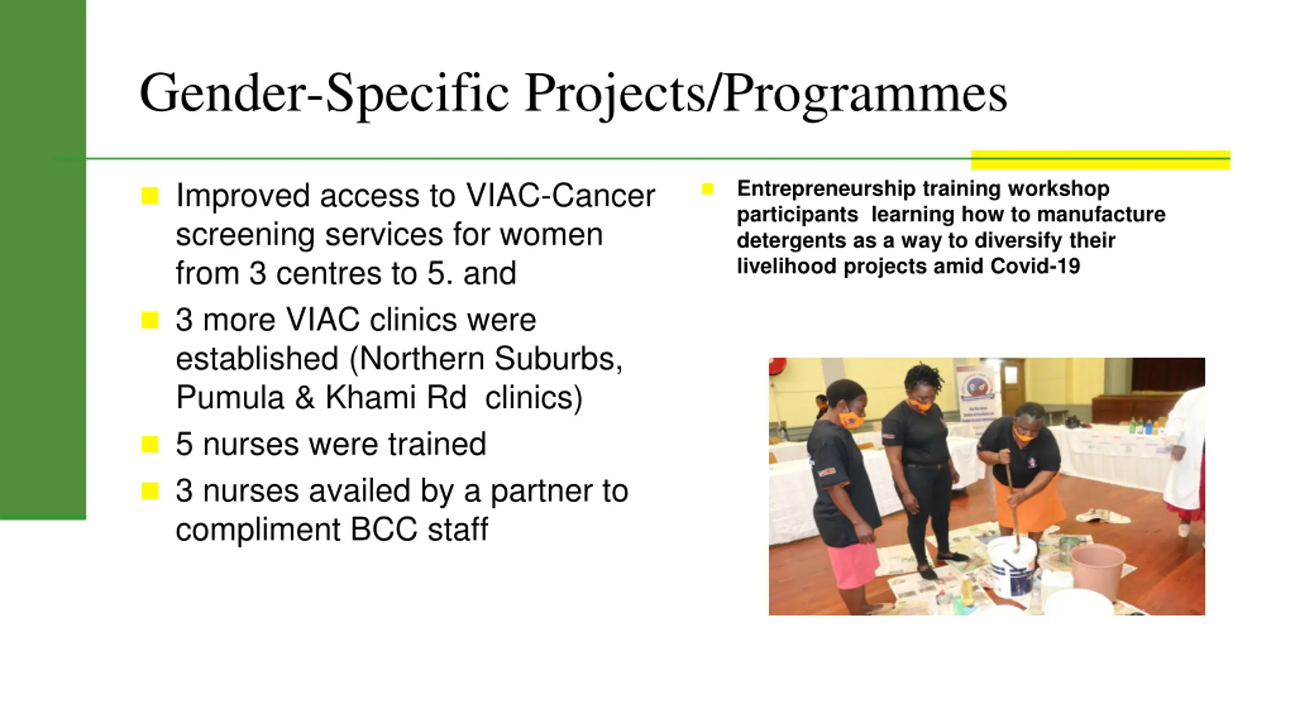 Gender-Specific Projects/Programmes Entrepreneurship training workshop participants learning how to manufacture detergents as a way to diversify their livelihood projects amid Covid-19 Improved access to VIAC-Cancer screening services for women from 3 centres to 5. and 3 more VIAC clinics were established (Northern Suburbs, Pumula & Khami Rd clinics) 5 nurses were trained 3 nurses availed by a partner to compliment BCC staff