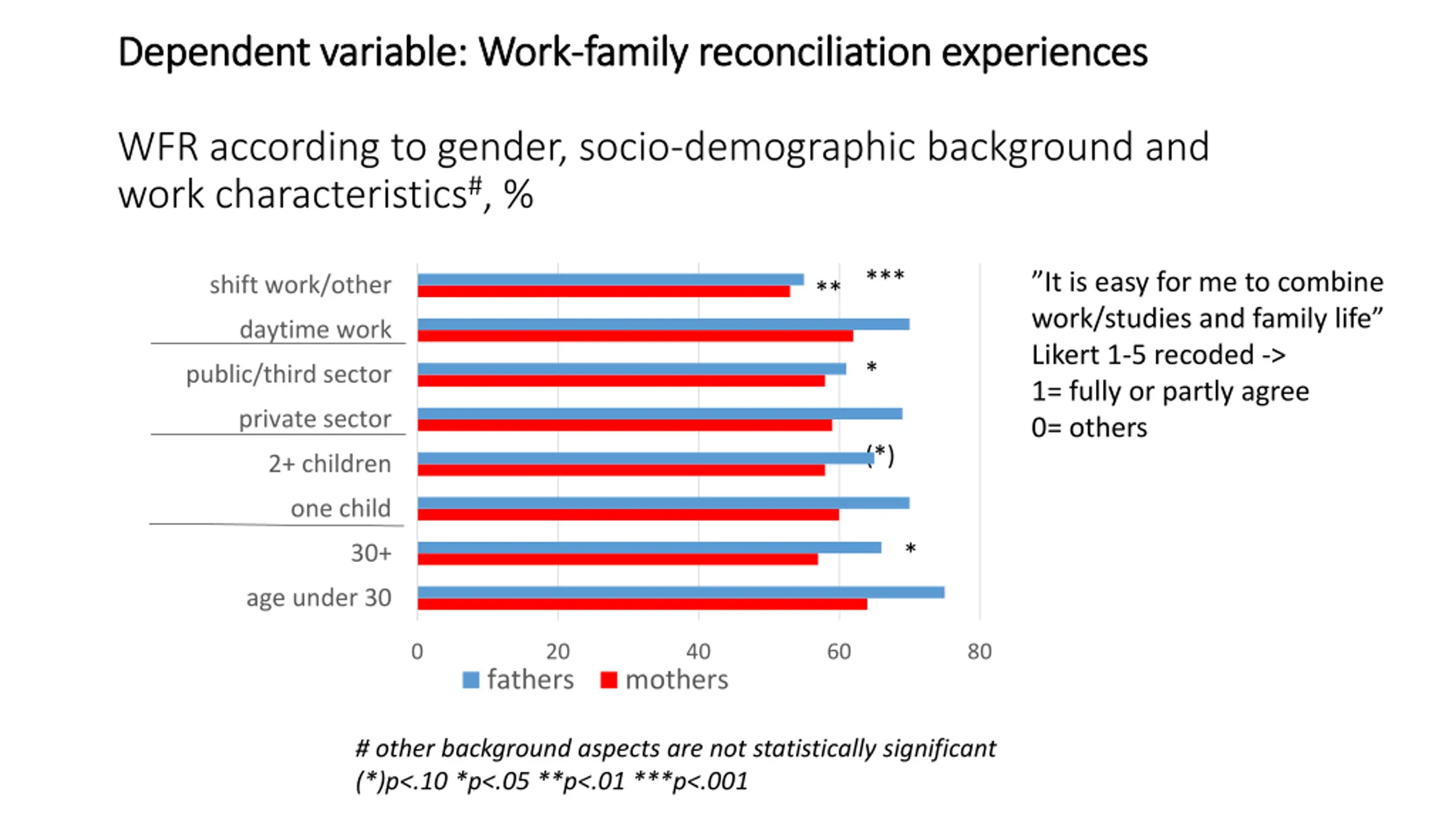Dependent Dependent variable variable: : Work Work- -family family reconciliation reconciliation experiences experiences WFR according to gender, socio-demographic background and work characteristics#, % *** It is easy for me to combine work/studies and family life Likert 1-5 recoded -> 1= fully or partly agree 0= others shift work/other ** daytime work * public/third sector private sector (*) 2+ children one child * 30+ age under 30 0 20 40 60 80 fathers mothers # other background aspects are not statistically significant (*)p<.10 *p<.05 **p<.01 ***p<.001