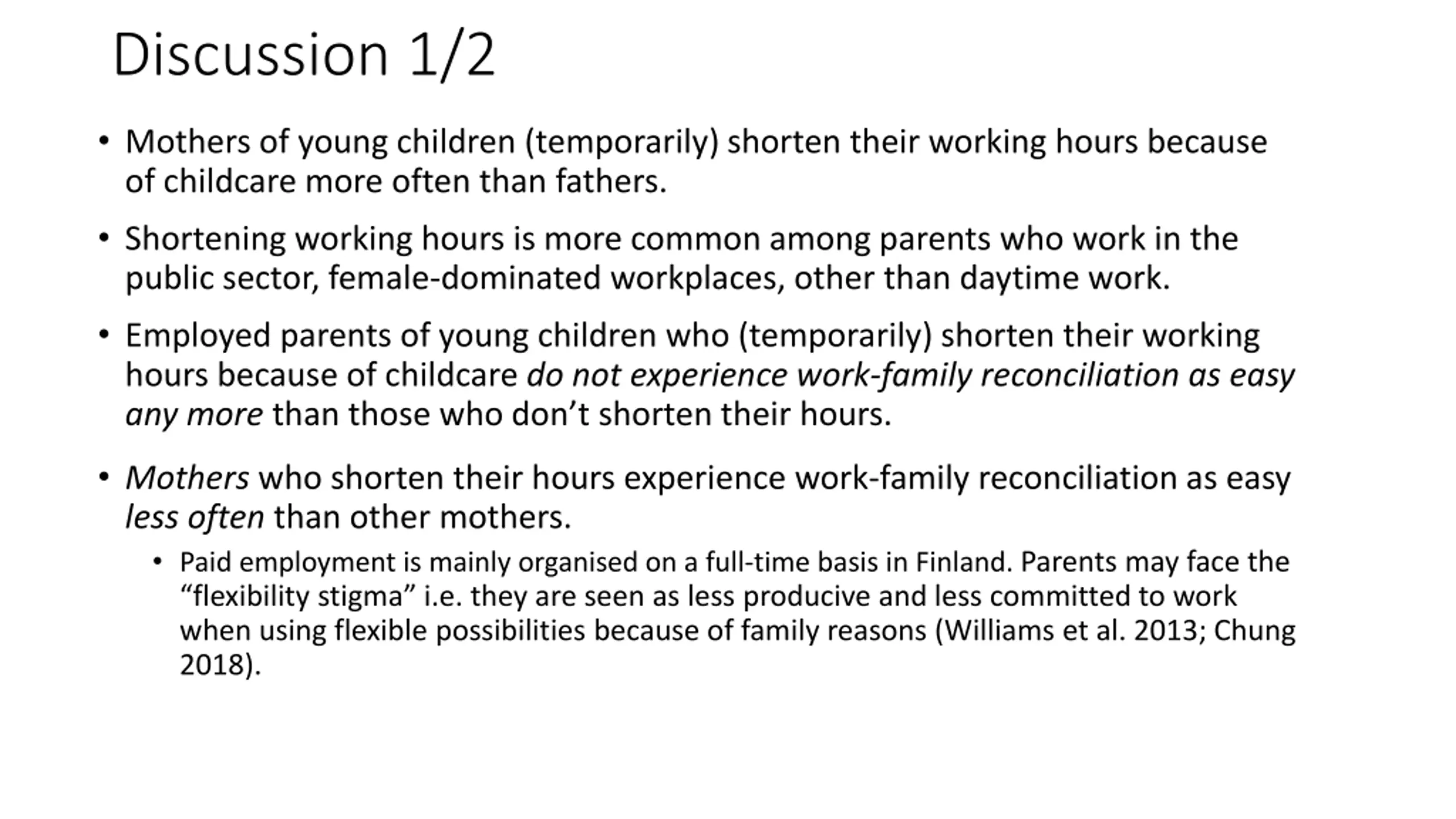Discussion 1/2 Mothers of young children (temporarily) shorten their working hours because of childcare more often than fathers. Shortening working hours is more common among parents who work in the public sector, female-dominated workplaces, other than daytime work. Employed parents of young children who (temporarily) shorten their working hours because of childcare do not experience work-family reconciliation as easy any more than those who don t shorten their hours. Mothers who shorten their hours experience work-family reconciliation as easy less often than other mothers. Paid employment is mainly organised on a full-time basis in Finland. Parents may face the flexibility stigma i.e. they are seen as less producive and less committed to work when using flexible possibilities because of family reasons (Williams et al. 2013; Chung 2018).