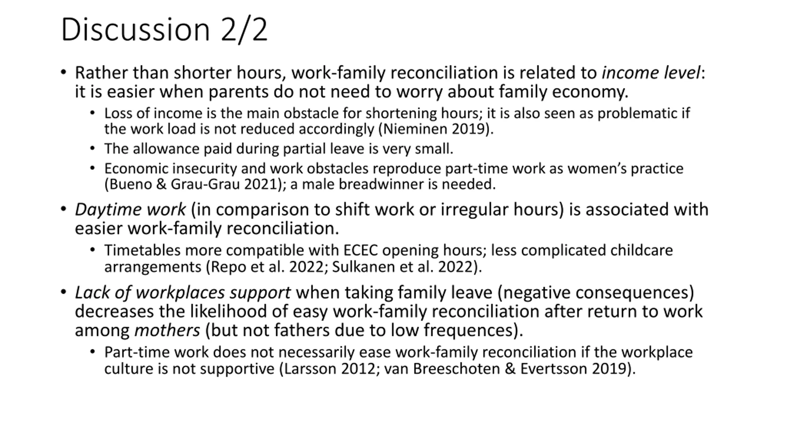 Discussion 2/2 Rather than shorter hours, work-family reconciliation is related to income level: it is easier when parents do not need to worry about family economy. Loss of income is the main obstacle for shortening hours; it is also seen as problematic if the work load is not reduced accordingly (Nieminen 2019). The allowance paid during partial leave is very small. Economic insecurity and work obstacles reproduce part-time work as women s practice (Bueno & Grau-Grau 2021); a male breadwinner is needed. Daytime work (in comparison to shift work or irregular hours) is associated with easier work-family reconciliation. Timetables more compatible with ECEC opening hours; less complicated childcare arrangements (Repo et al. 2022; Sulkanen et al. 2022). Lack of workplaces support when taking family leave (negative consequences) decreases the likelihood of easy work-family reconciliation after return to work among mothers (but not fathers due to low frequences). Part-time work does not necessarily ease work-family reconciliation if the workplace culture is not supportive (Larsson 2012; van Breeschoten & Evertsson 2019).