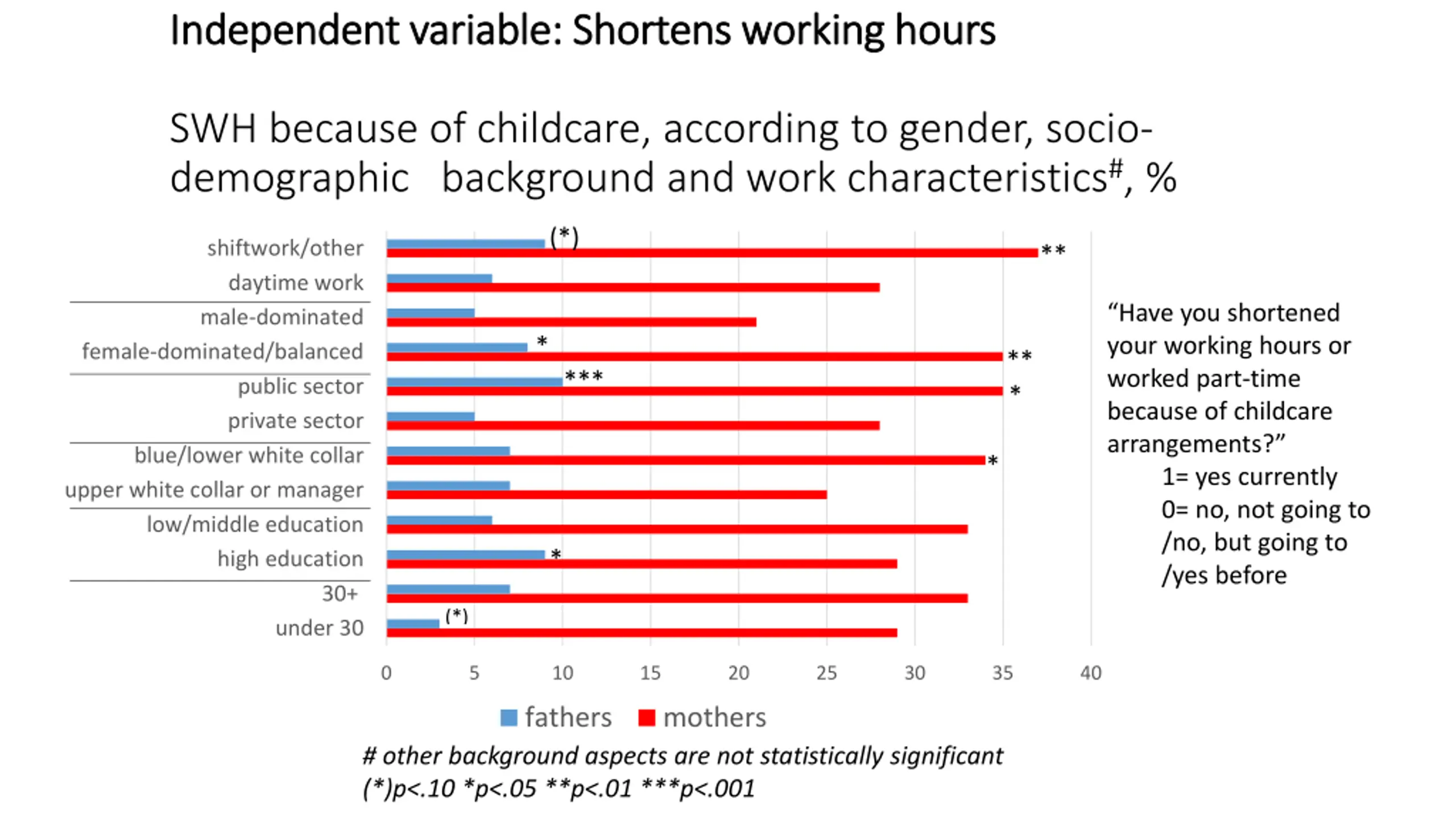 Independent Independent variable variable: : Shortens Shortens working working hours hours SWH because of childcare, according to gender, socio- demographic background and work characteristics#, % (*) shiftwork/other ** daytime work Have you shortened your working hours or worked part-time because of childcare arrangements? 1= yes currently 0= no, not going to /no, but going to /yes before male-dominated * female-dominated/balanced ** *** public sector * private sector blue/lower white collar * upper white collar or manager low/middle education * high education 30+ (*) under 30 0 5 10 15 20 25 30 35 40 fathers mothers # other background aspects are not statistically significant (*)p<.10 *p<.05 **p<.01 ***p<.001