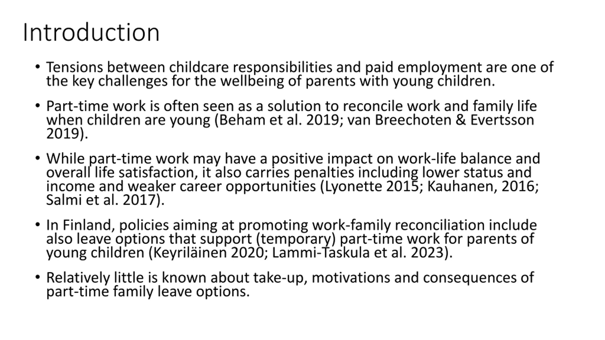 Introduction Tensions between childcare responsibilities and paid employment are one of the key challenges for the wellbeing of parents with young children. Part-time work is often seen as a solution to reconcile work and family life when children are young (Beham et al. 2019; van Breechoten & Evertsson 2019). While part-time work may have a positive impact on work-life balance and overall life satisfaction, it also carries penalties including lower status and income and weaker career opportunities (Lyonette 2015; Kauhanen, 2016; Salmi et al. 2017). In Finland, policies aiming at promoting work-family reconciliation include also leave options that support (temporary) part-time work for parents of young children (Keyril inen 2020; Lammi-Taskula et al. 2023). Relatively little is known about take-up, motivations and consequences of part-time family leave options.