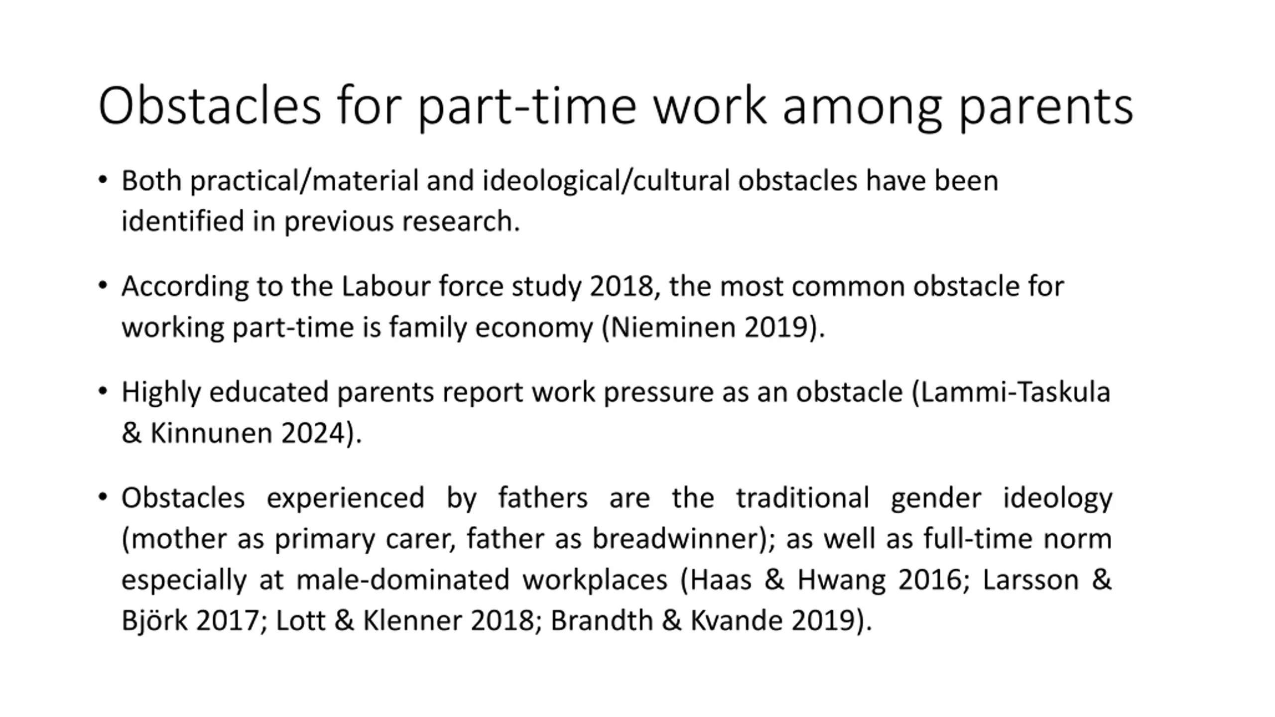 Obstacles for part-time work among parents Both practical/material and ideological/cultural obstacles have been identified in previous research. According to the Labour force study 2018, the most common obstacle for working part-time is family economy (Nieminen 2019). Highly educated parents report work pressure as an obstacle (Lammi-Taskula & Kinnunen 2024). Obstacles experienced by fathers are the traditional gender ideology (mother as primary carer, father as breadwinner); as well as full-time norm especially at male-dominated workplaces (Haas & Hwang 2016; Larsson & Bj rk 2017; Lott & Klenner 2018; Brandth & Kvande 2019).