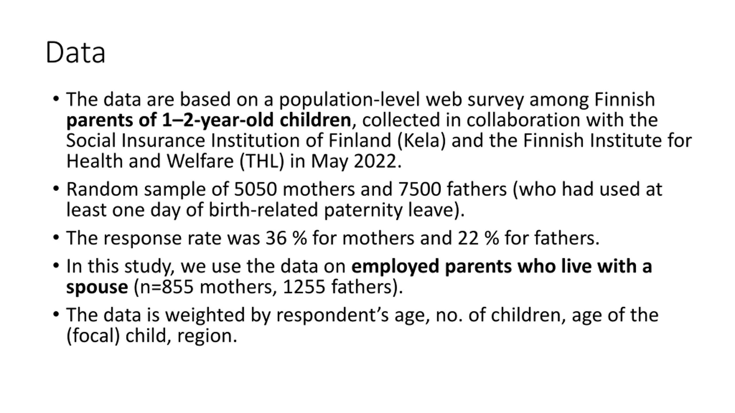 Data The data are based on a population-level web survey among Finnish parents of 1 2-year-old children, collected in collaboration with the Social Insurance Institution of Finland (Kela) and the Finnish Institute for Health and Welfare (THL) in May 2022. Random sample of 5050 mothers and 7500 fathers (who had used at least one day of birth-related paternity leave). The response rate was 36 % for mothers and 22 % for fathers. In this study, we use the data on employed parents who live with a spouse (n=855 mothers, 1255 fathers). The data is weighted by respondent s age, no. of children, age of the (focal) child, region.