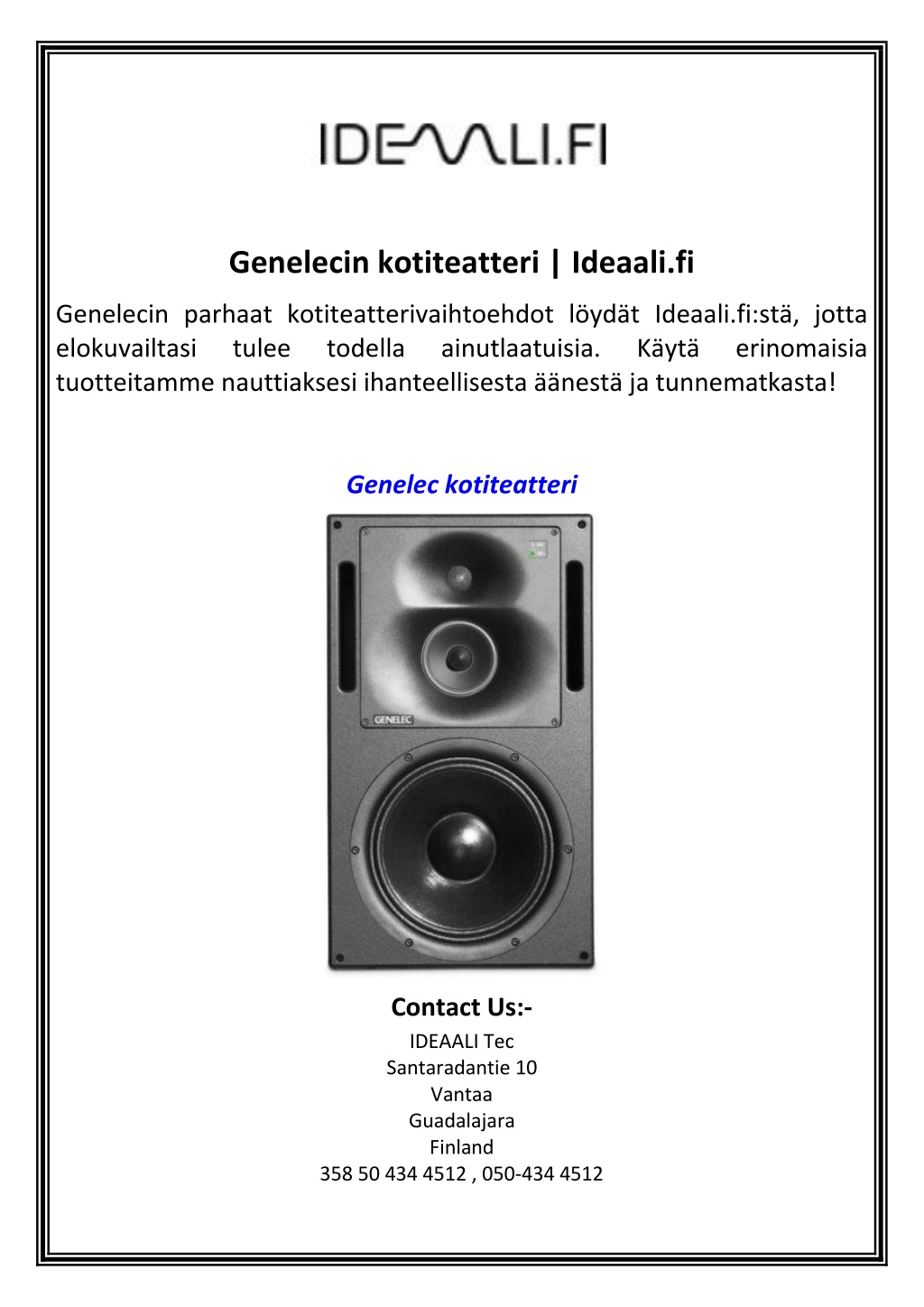 Genelecin parhaat kotiteatterivaihtoehdot lu00f6ydu00e4t Ideaali.fi:stu00e4, jotta elokuvailtasi tulee todella ainutlaatuisia. Ku00e4ytu00e4 erinomaisia tuotteitamme nauttiaksesi ihanteellisesta u00e4u00e4nestu00e4 ja tunnematkasta!nn//id