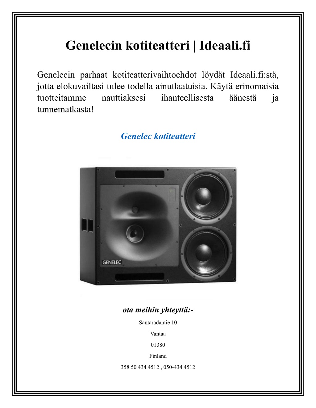 Genelecin kotiteatteri | Ideaali.fi Genelecin parhaat kotiteatterivaihtoehdot l yd t Ideaali.fi:st , jotta elokuvailtasi tulee todella ainutlaatuisia. K yt erinomaisia tuotteitamme nauttiaksesi tunnematkasta! ihanteellisesta nest ja Genelec kotiteatteri ota meihin yhteytt :- Santaradantie 10 Vantaa 01380 Finland 358 50 434 4512 , 050-434 4512