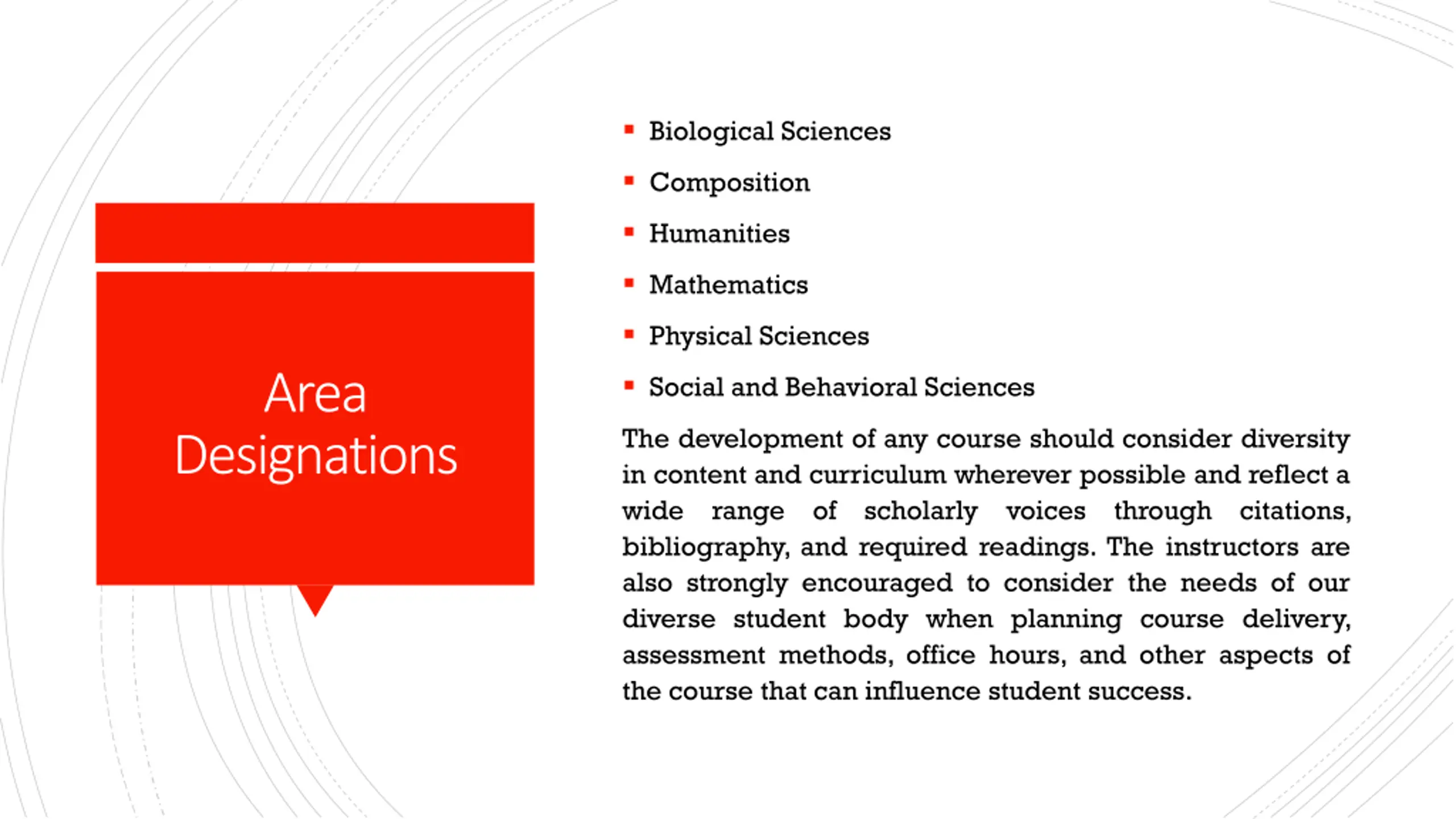 Biological Sciences Composition Humanities Mathematics Physical Sciences Area Social and Behavioral Sciences The development of any course should consider diversity in content and curriculum wherever possible and reflect a wide range of scholarly bibliography, and required readings. The instructors are also strongly encouraged to consider the needs of our diverse student body when planning course delivery, assessment methods, office hours, and other aspects of the course that can influence student success. Designations voices through citations,