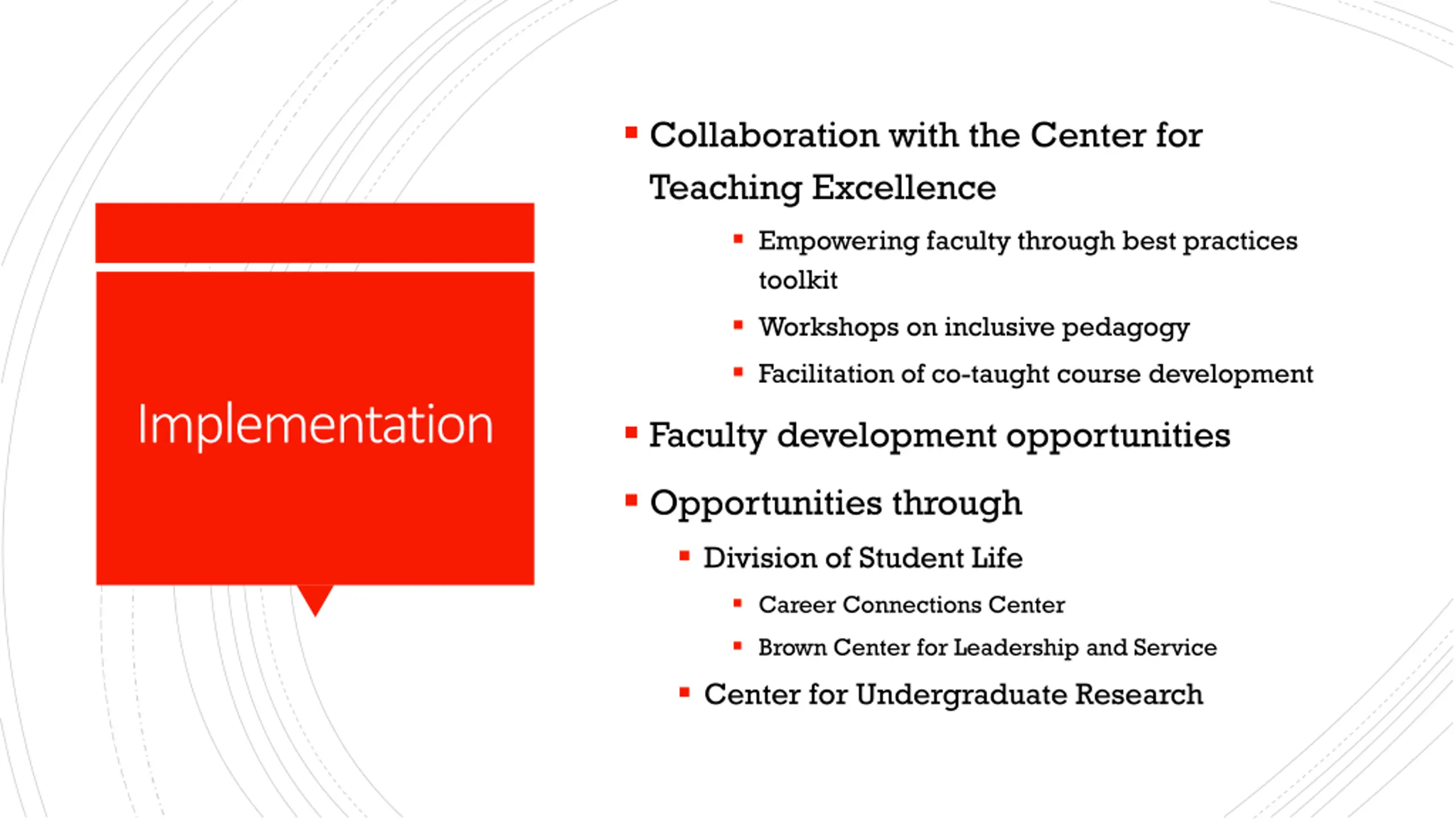 Collaboration with the Center for Teaching Excellence Empowering faculty through best practices toolkit Workshops on inclusive pedagogy Facilitation of co-taught course development Implementation Faculty development opportunities Opportunities through Division of Student Life Career Connections Center Brown Center for Leadership and Service Center for Undergraduate Research