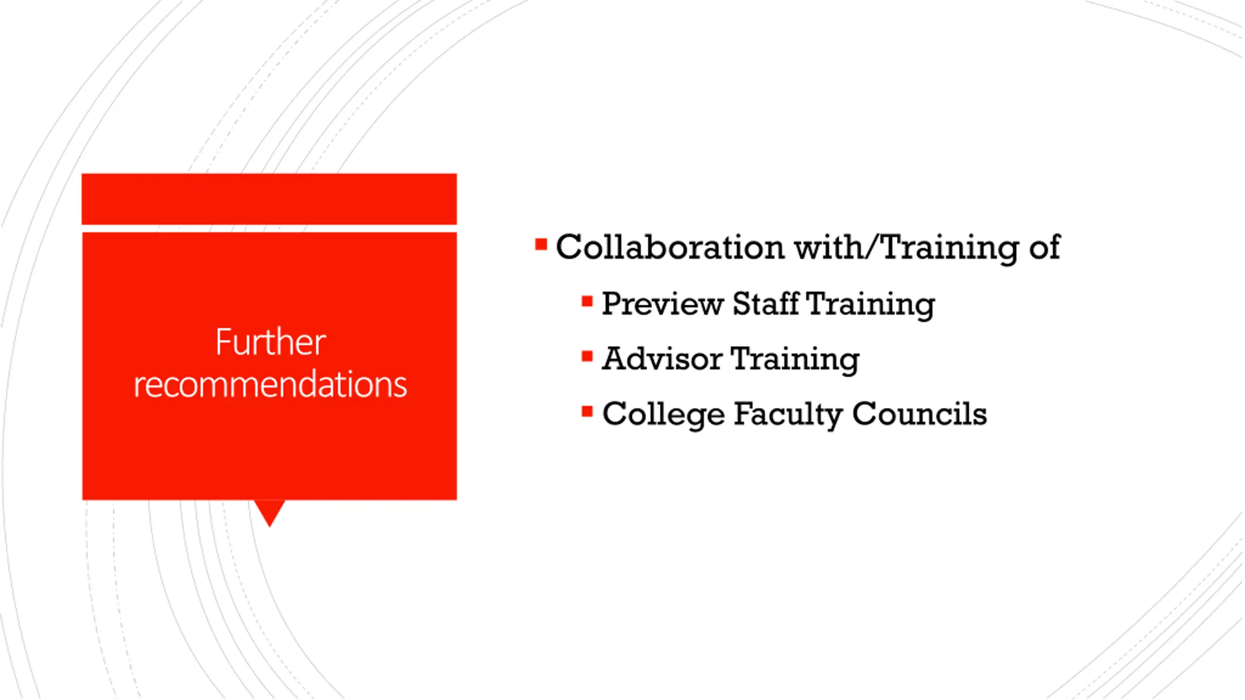 Collaboration with/Training of Preview Staff Training Advisor Training College Faculty Councils Further recommendations