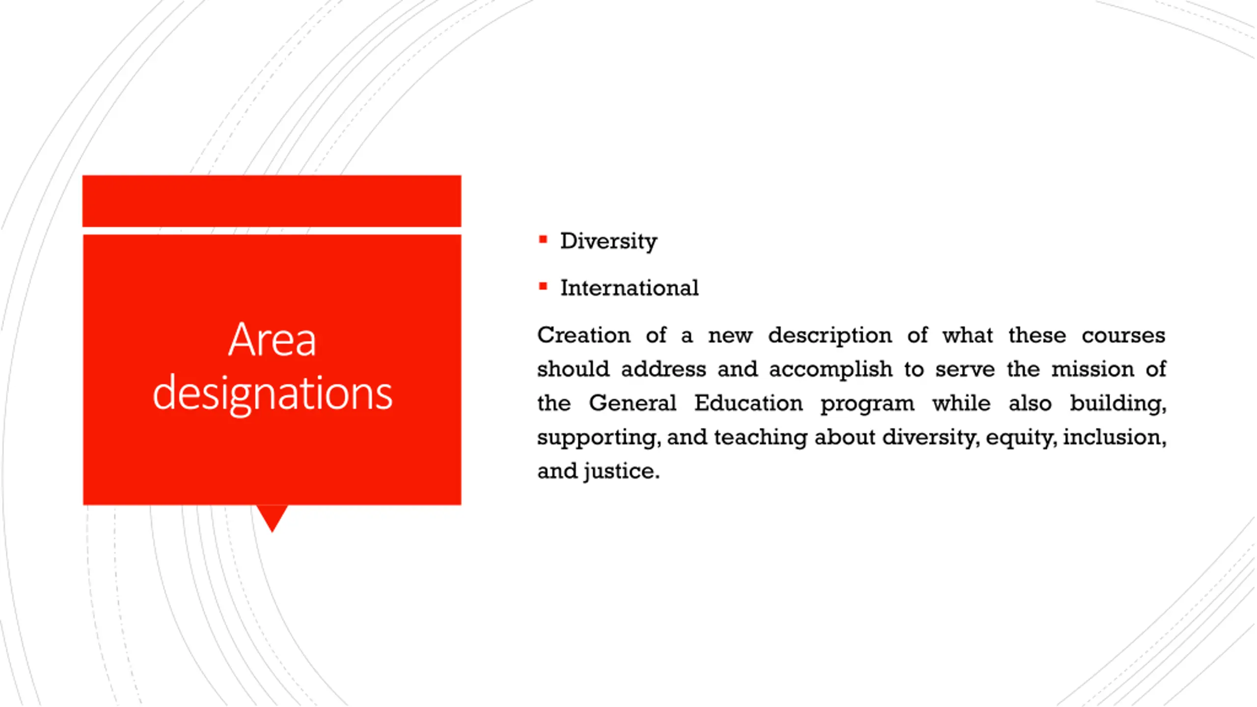 Diversity International Area Creation of a new description of what these courses should address and accomplish to serve the mission of the General Education program while also building, supporting,and teaching about diversity,equity,inclusion, and justice. designations