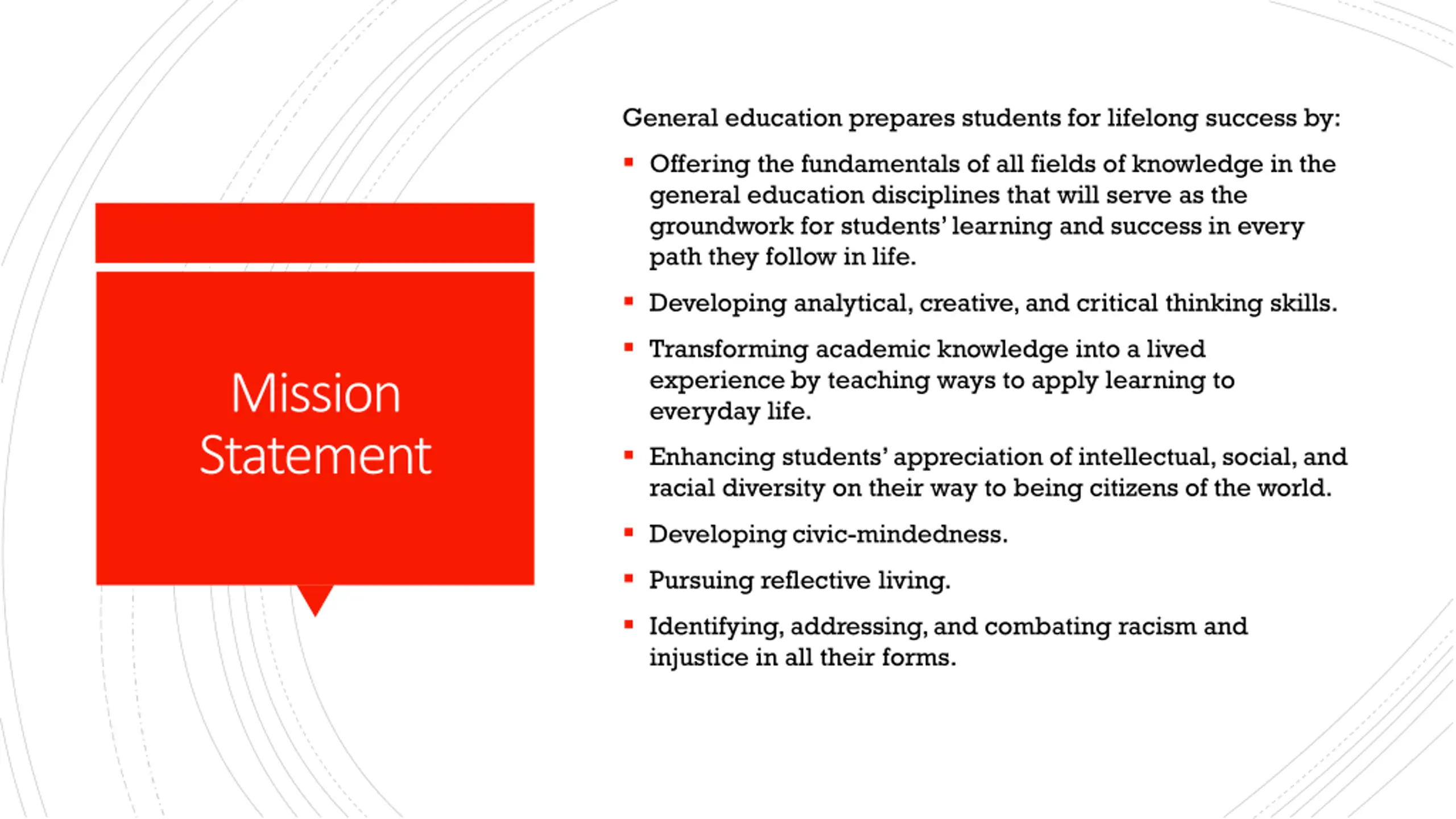 General education prepares students for lifelong success by: Offering the fundamentals of all fields of knowledge in the general education disciplines that will serve as the groundwork for students learning and success in every path they follow in life. Developing analytical, creative, and critical thinking skills. Transforming academic knowledge into a lived experienceby teaching ways to apply learning to everyday life. Mission Statement Enhancing students appreciation of intellectual, social, and racial diversity on their way to being citizens of the world. Developingcivic-mindedness. Pursuing reflective living. Identifying, addressing,and combating racism and injustice in all their forms.