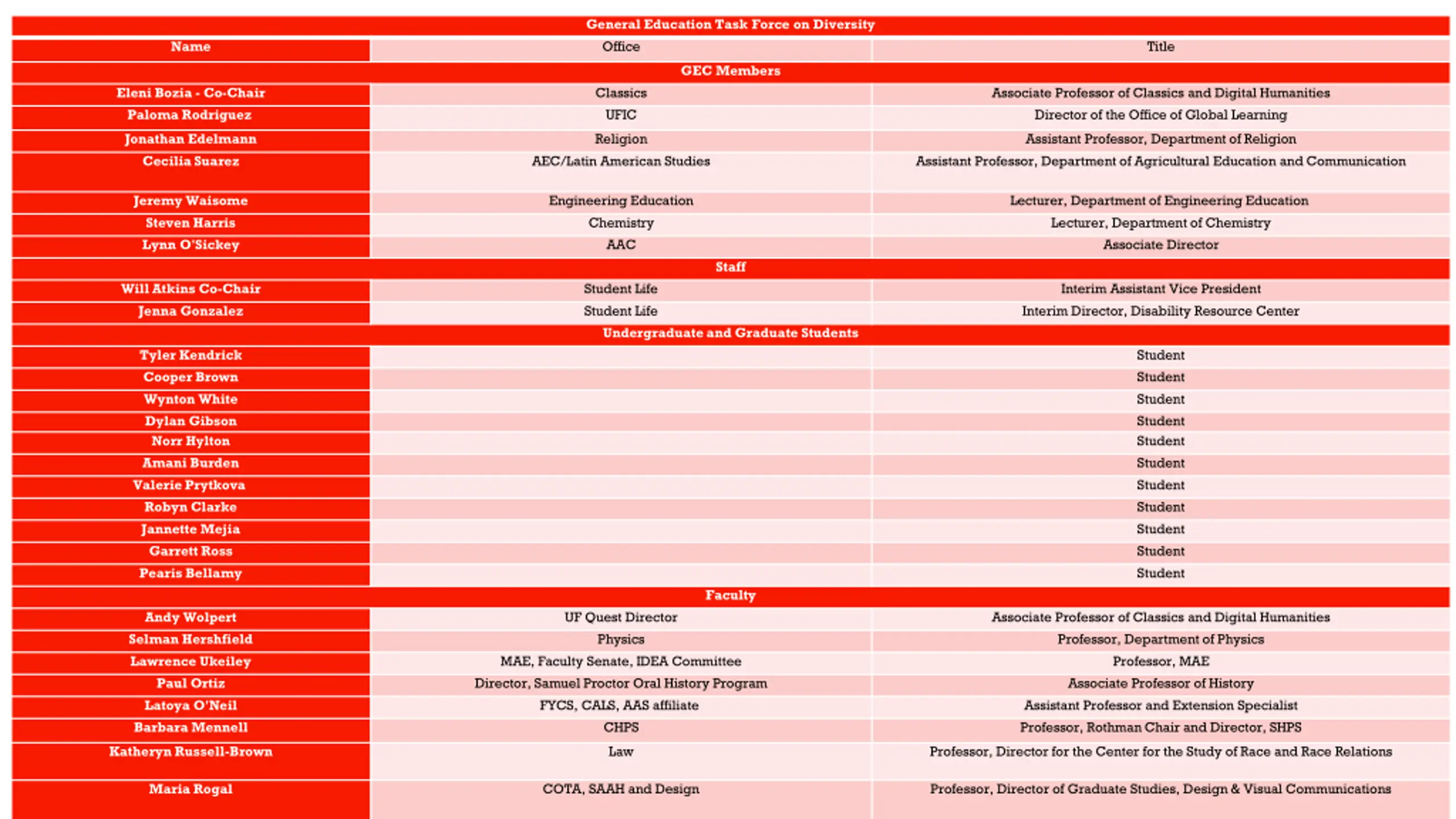 General Education Task Force on Diversity Office Name Title GEC Members Eleni Bozia - Co-Chair Paloma Rodriguez Classics UFIC Associate Professor of Classics and Digital Humanities Director of the Office of Global Learning Jonathan Edelmann Cecilia Suarez Religion Assistant Professor, Department of Religion Assistant Professor, Department of Agricultural Education and Communication AEC/Latin American Studies Jeremy Waisome Steven Harris Lynn O'Sickey Engineering Education Chemistry AAC Lecturer, Department of Engineering Education Lecturer, Department of Chemistry Associate Director Staff Will Atkins Co-Chair Jenna Gonzalez Student Life Student Life Undergraduate and Graduate Students Interim Assistant Vice President Interim Director, Disability Resource Center Tyler Kendrick Cooper Brown Wynton White Dylan Gibson Norr Hylton Amani Burden Valerie Prytkova Robyn Clarke Jannette Mejia Garrett Ross Pearis Bellamy Student Student Student Student Student Student Student Student Student Student Student Faculty Andy Wolpert Selman Hershfield Lawrence Ukeiley Paul Ortiz Latoya O'Neil Barbara Mennell UF Quest Director Physics Associate Professor of Classics and Digital Humanities Professor, Department of Physics Professor, MAE Associate Professor of History Assistant Professor and Extension Specialist Professor, Rothman Chair and Director, SHPS MAE, Faculty Senate, IDEA Committee Director, Samuel Proctor Oral History Program FYCS, CALS, AAS affiliate CHPS Katheryn Russell-Brown Law Professor, Director for the Center for the Study of Race and Race Relations Maria Rogal COTA, SAAH and Design Professor, Director of Graduate Studies, Design & Visual Communications