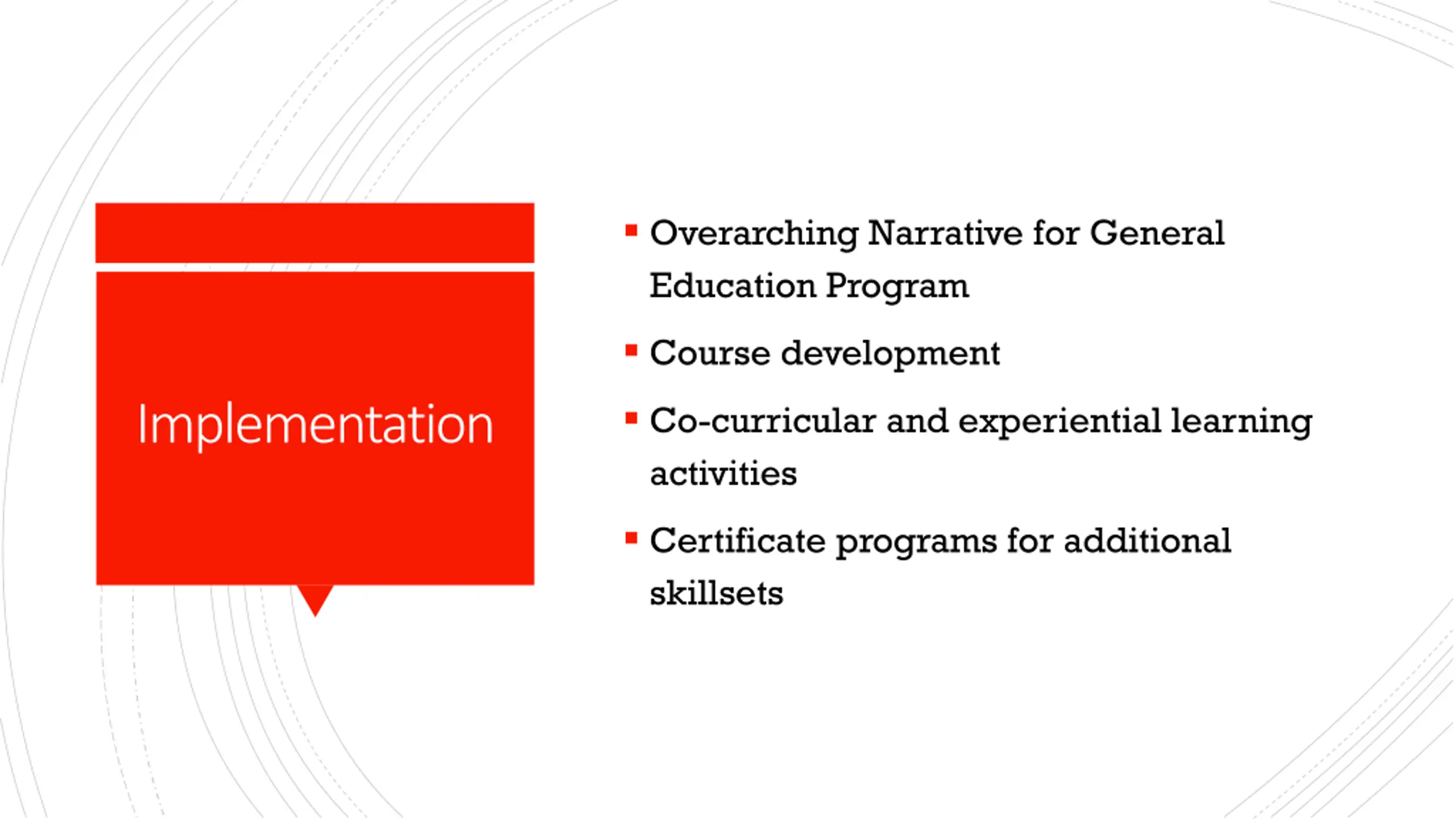 Overarching Narrative for General Education Program Course development Co-curricular and experiential learning activities Implementation Certificate programs for additional skillsets