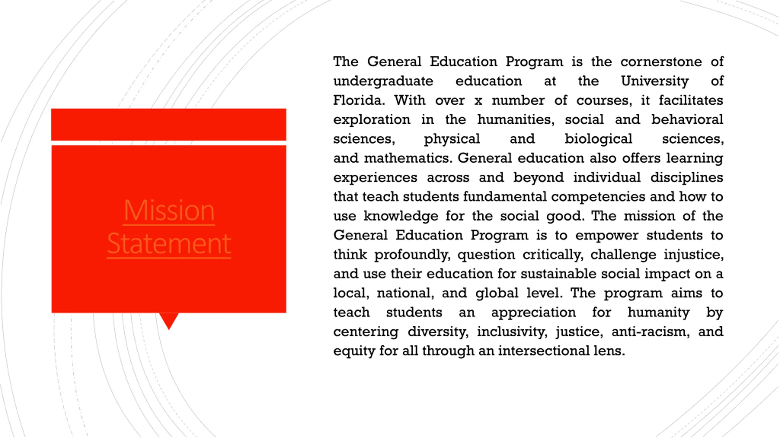 The General Education Program is the cornerstone of undergraduate education Florida. With over x number of courses, it facilitates exploration in the humanities, social and behavioral sciences, physical and and mathematics. General education also offers learning experiences across and beyond individual disciplines that teach students fundamental competencies and how to use knowledge for the social good. The mission of the General Education Program is to empower students to think profoundly, question critically, challenge injustice, and use their education for sustainable social impact on a local, national, and global level. The program aims to teach students an appreciation centering diversity, inclusivity, justice, anti-racism, and equity for all through an intersectional lens. at the University of biological sciences, Mission Statement for humanity by