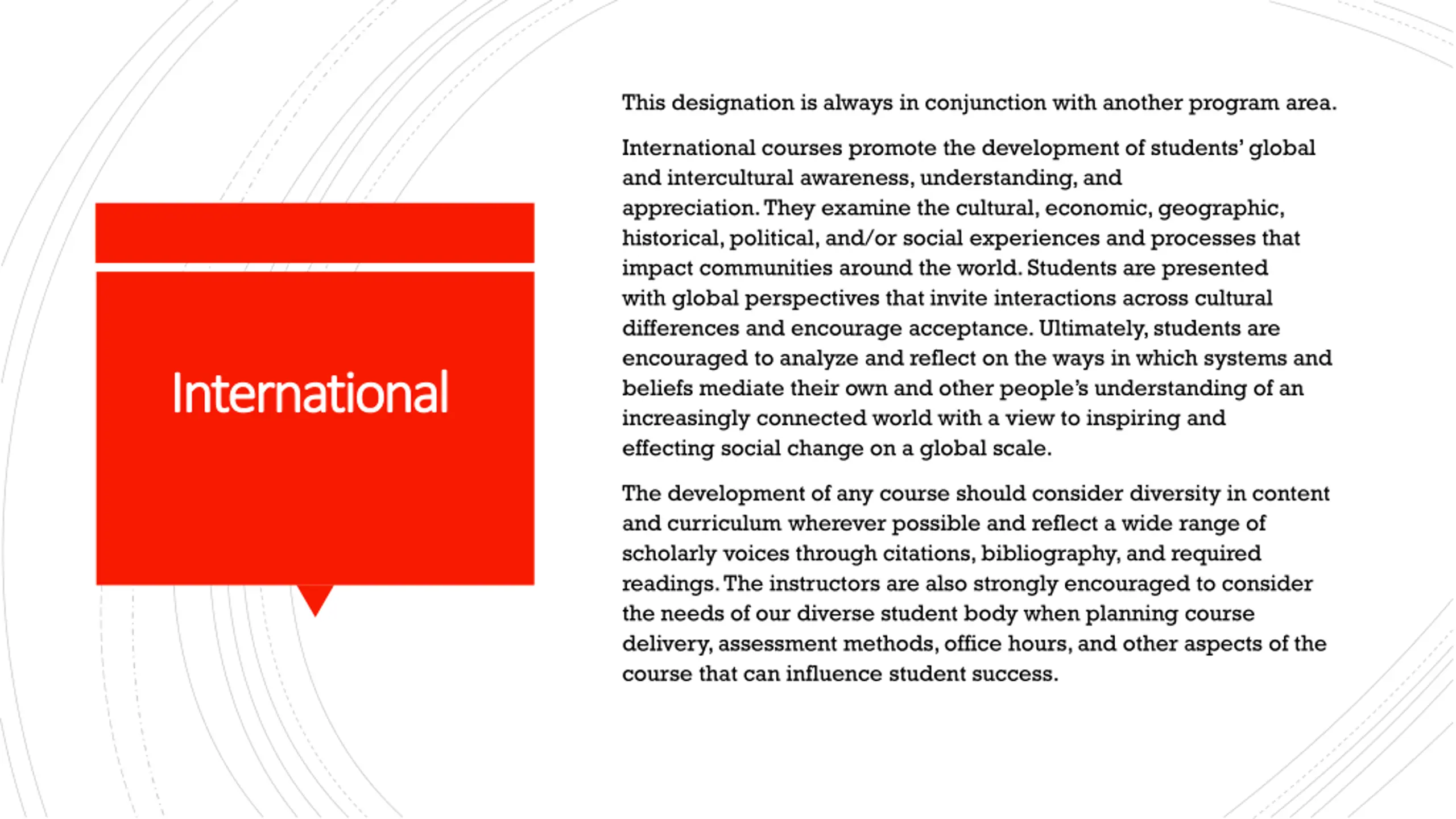 This designation is always in conjunction with another program area. International courses promote the development of students global and intercultural awareness, understanding, and appreciation.They examine the cultural, economic, geographic, historical, political, and/or social experiences and processes that impact communities around the world. Students are presented with global perspectives that invite interactions across cultural differences and encourage acceptance.Ultimately, students are encouraged to analyze and reflect on the ways in which systems and beliefs mediate their own and other people s understanding of an increasingly connected world with a view to inspiring and effecting social change on a global scale. International International The development of any course should consider diversity in content and curriculum wherever possible and reflect a wide range of scholarly voices through citations, bibliography, and required readings. The instructors are also strongly encouraged to consider the needs of our diverse student body when planning course delivery, assessment methods, office hours, and other aspects of the course that can influence student success.
