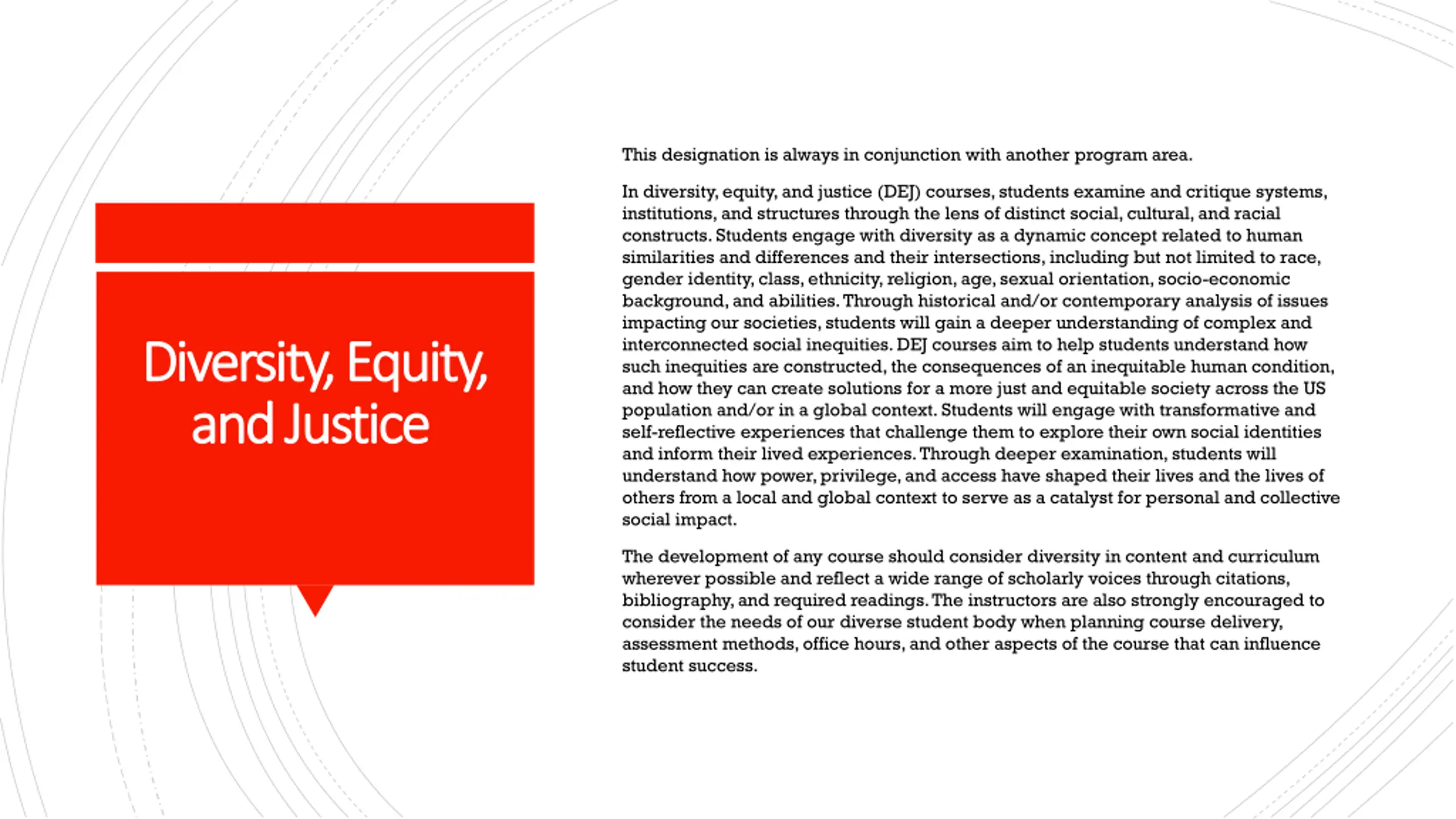 This designation is always in conjunction with another program area. In diversity, equity, and justice (DEJ) courses, students examine and critique systems, institutions, and structures through the lens of distinct social, cultural, and racial constructs. Students engage with diversity as a dynamic concept related to human similarities and differences and their intersections, including but not limited to race, gender identity, class, ethnicity, religion, age, sexual orientation, socio-economic background, and abilities. Through historical and/or contemporary analysis of issues impacting our societies, students will gain a deeper understanding of complex and interconnected social inequities. DEJ courses aim to help students understand how such inequities are constructed,the consequences of an inequitable human condition, and how they can create solutions for a more just and equitable society across the US population and/or in a global context. Students will engage with transformative and self-reflective experiences that challenge them to explore their own social identities and inform their lived experiences. Through deeper examination, students will understand how power, privilege, and access have shaped their lives and the lives of others from a local and global context to serve as a catalyst for personal and collective social impact. Diversity, Equity, Diversity, Equity, and Justice and Justice The development of any course should consider diversity in content and curriculum wherever possible and reflect a wide range of scholarly voices through citations, bibliography, and required readings. The instructors are also strongly encouraged to consider the needs of our diverse student body when planning course delivery, assessment methods, office hours, and other aspects of the course that can influence student success.