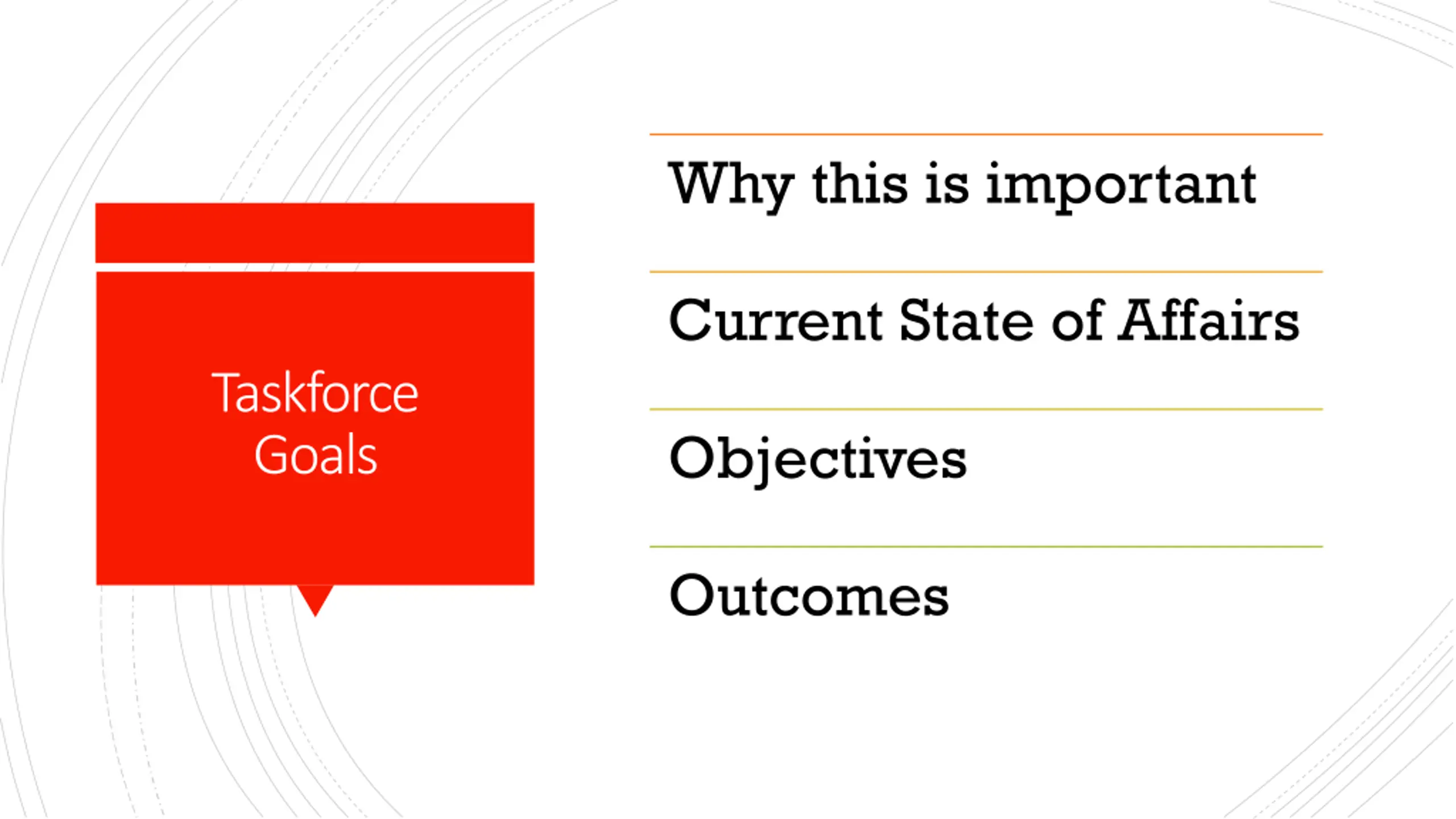 Why this is important Current State of Affairs Taskforce Goals Objectives Outcomes