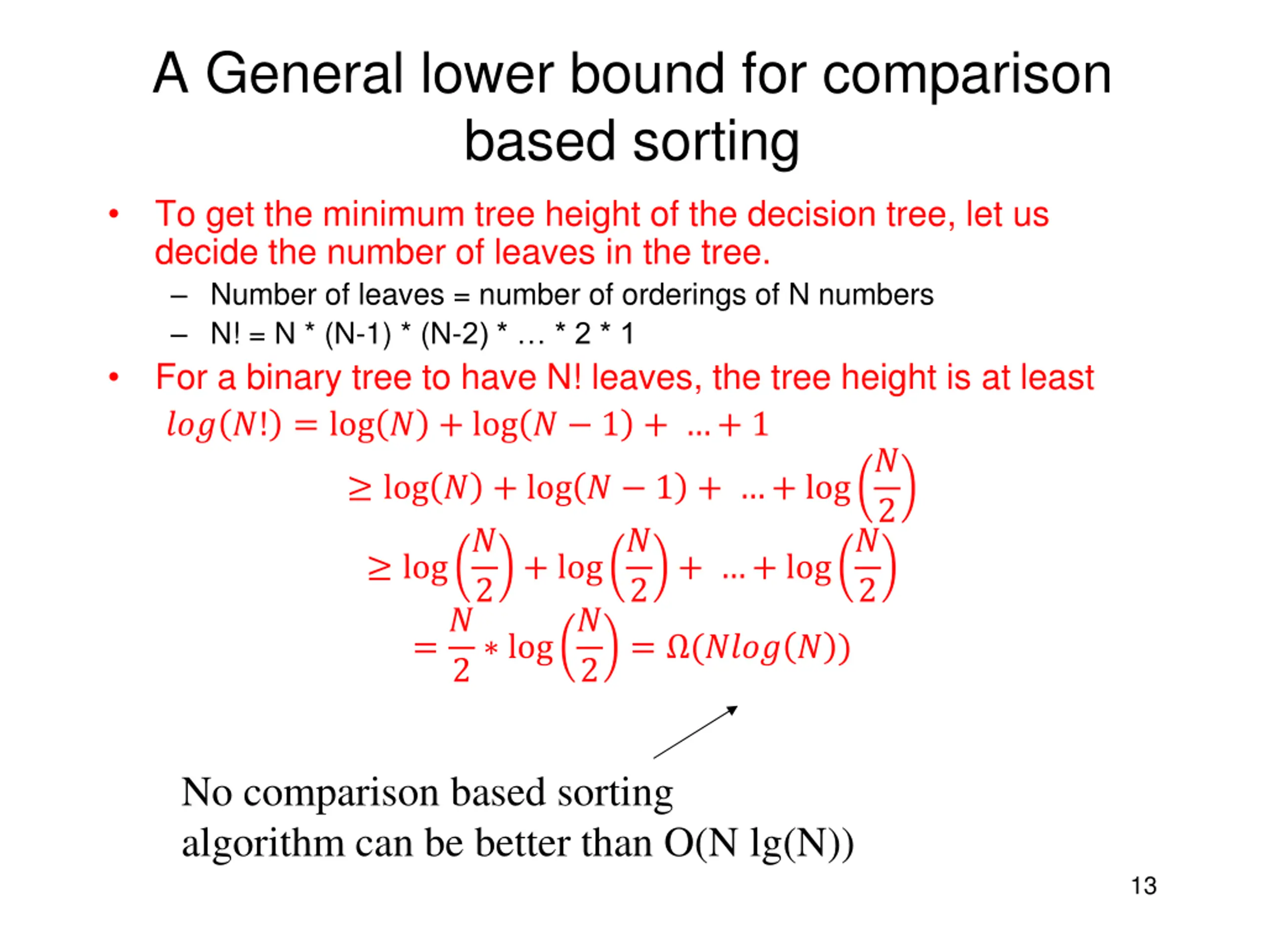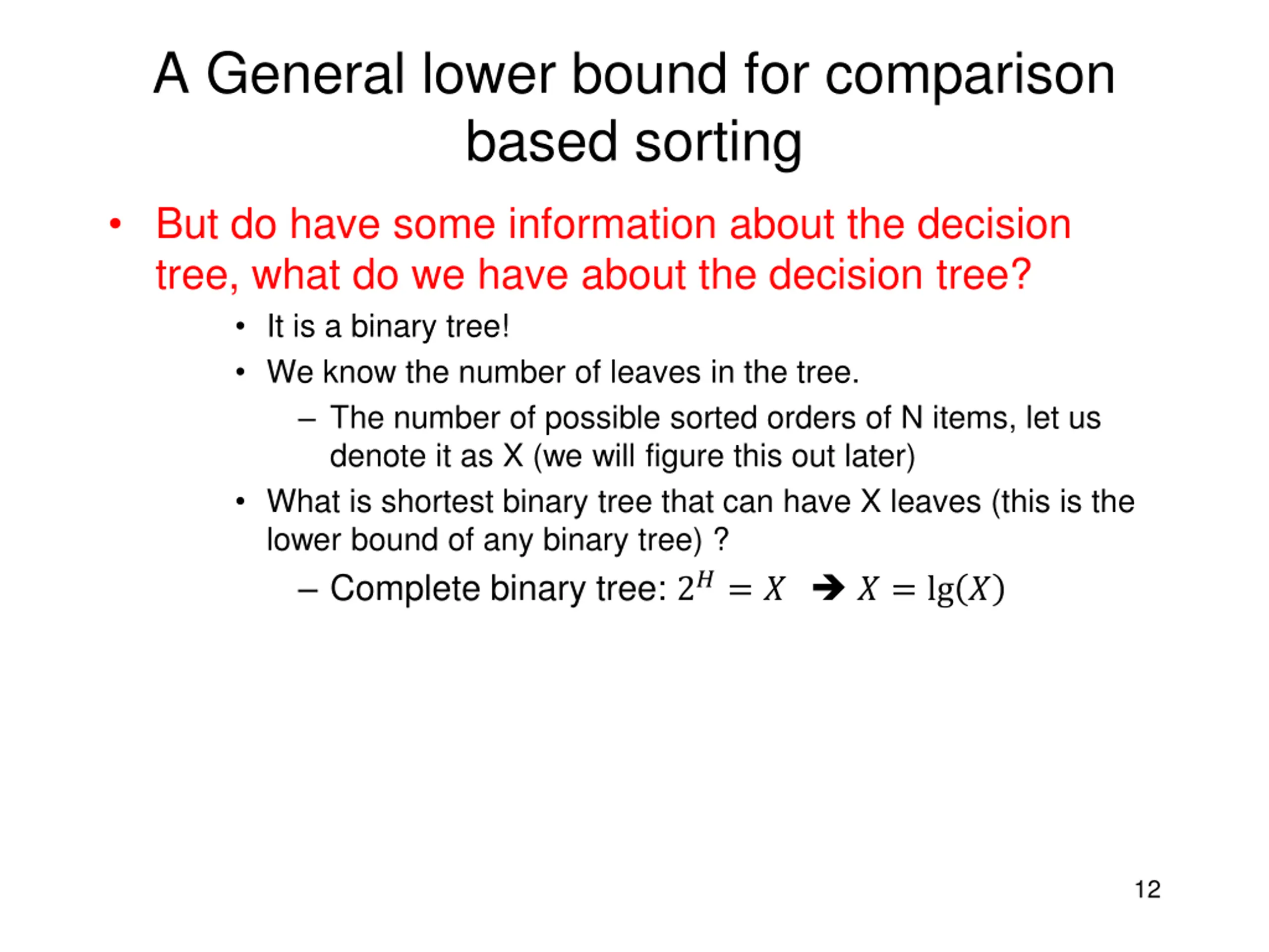 A General lower bound for comparison based sorting But do have some information about the decision tree, what do we have about the decision tree? It is a binary tree! We know the number of leaves in the tree. The number of possible sorted orders of N items, let us denote it as X (we will figure this out later) What is shortest binary tree that can have X leaves (this is the lower bound of any binary tree) ? Complete binary tree: 2?= ? ? = lg ? 12