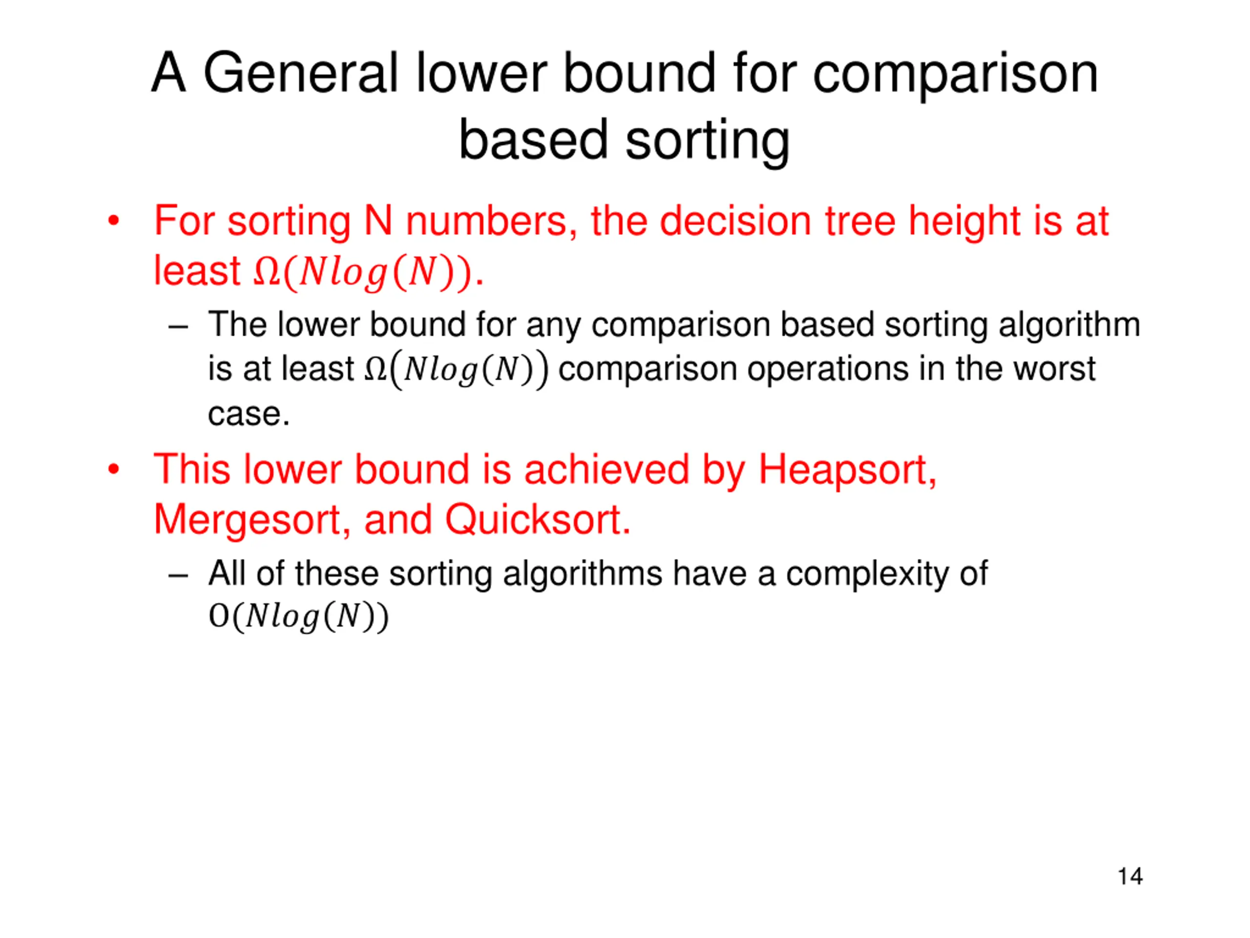 A General lower bound for comparison based sorting For sorting N numbers, the decision tree height is at least (???? ? ). The lower bound for any comparison based sorting algorithm is at least ???? ? comparison operations in the worst case. This lower bound is achieved by Heapsort, Mergesort, and Quicksort. All of these sorting algorithms have a complexity of O(???? ? ) 14