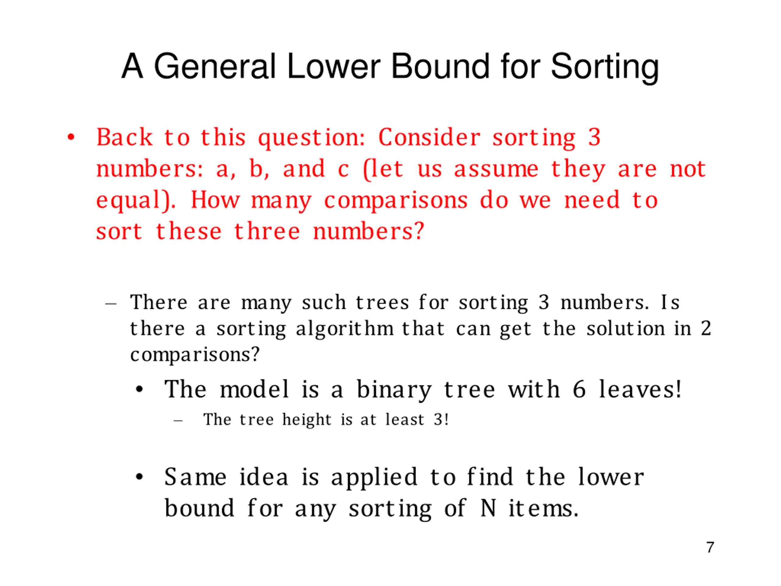 A General Lower Bound for Sorting Consider sorting 3 numbers: a, b, and c (let us assume they are not equal). How many comparisons do we need to sort these three numbers? Can we do it with one comparison? Can we do it with two comparisons? 3