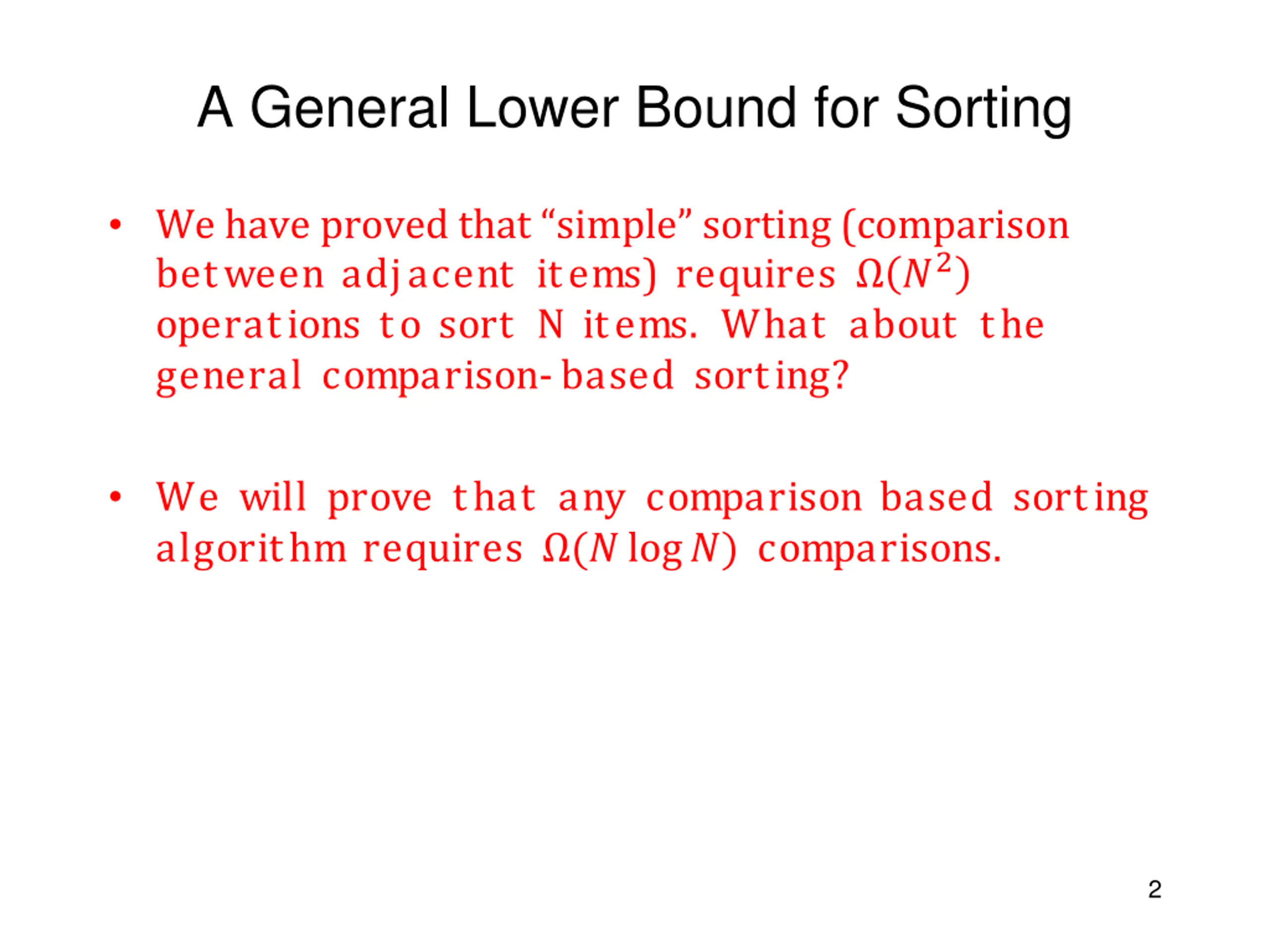 A General Lower Bound for Sorting We have proved that simple sorting (comparison between adjacent items) requires ?2 operations to sort N items. What about the general comparison-based sorting? We will prove that any comparison based sorting algorithm requires (?log?) comparisons. 2