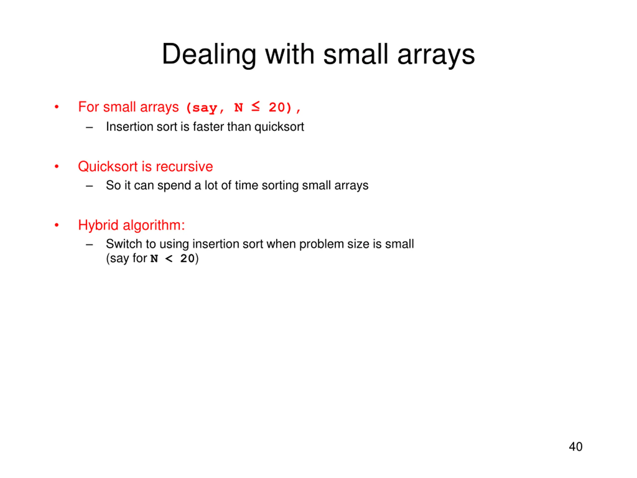 Dealing with small arrays For small arrays (say, N 20), Insertion sort is faster than quicksort Quicksort is recursive So it can spend a lot of time sorting small arrays Hybrid algorithm: Switch to using insertion sort when problem size is small (say for N < 20) 40