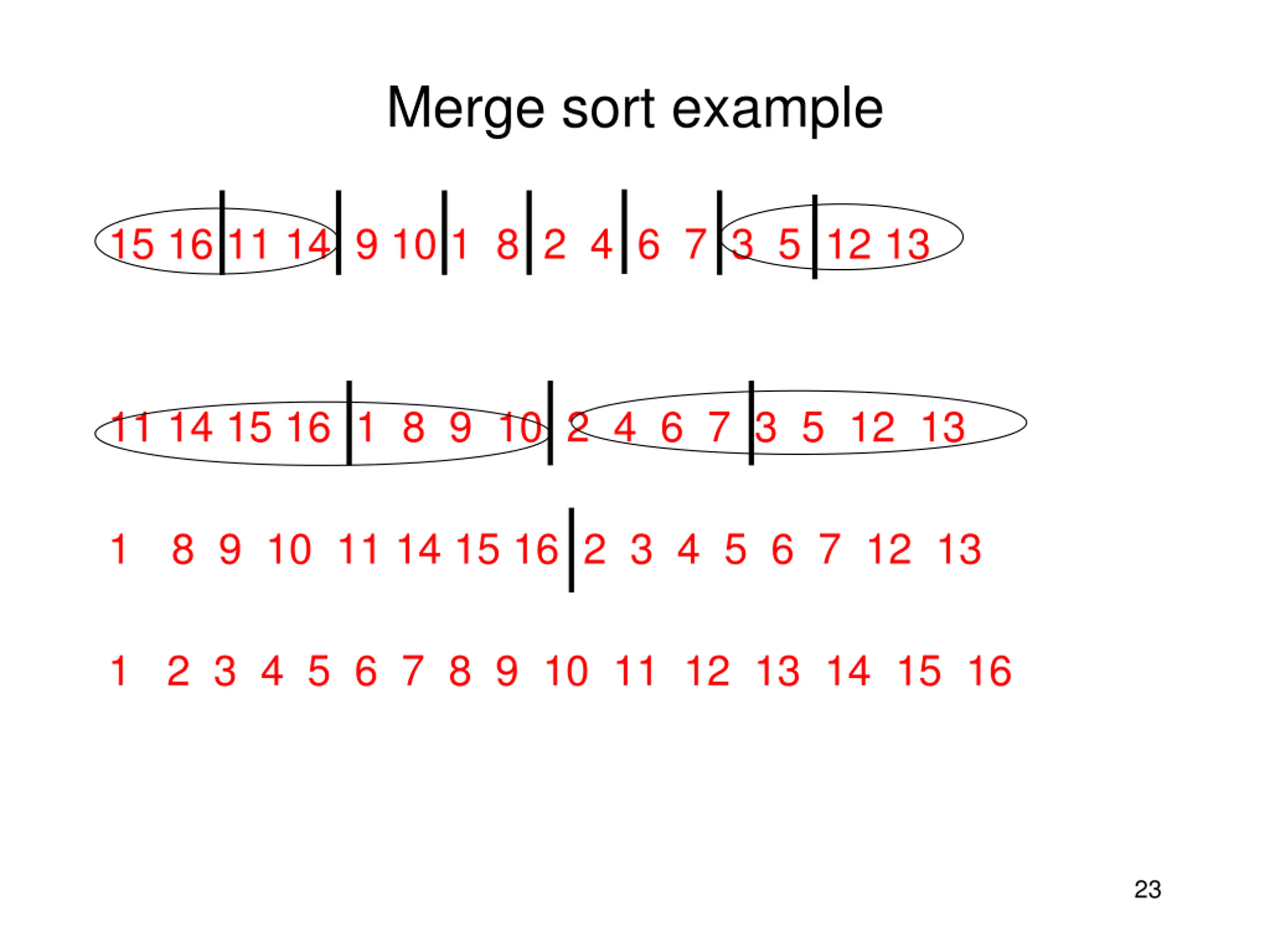 Merge sort example 15 16 11 14 9 10 1 8 2 4 6 7 3 5 12 13 11 14 15 16 1 8 9 10 2 4 6 7 3 5 12 13 1 8 9 10 11 14 15 16 2 3 4 5 6 7 12 13 1 2 3 4 5 6 7 8 9 10 11 12 13 14 15 16 23