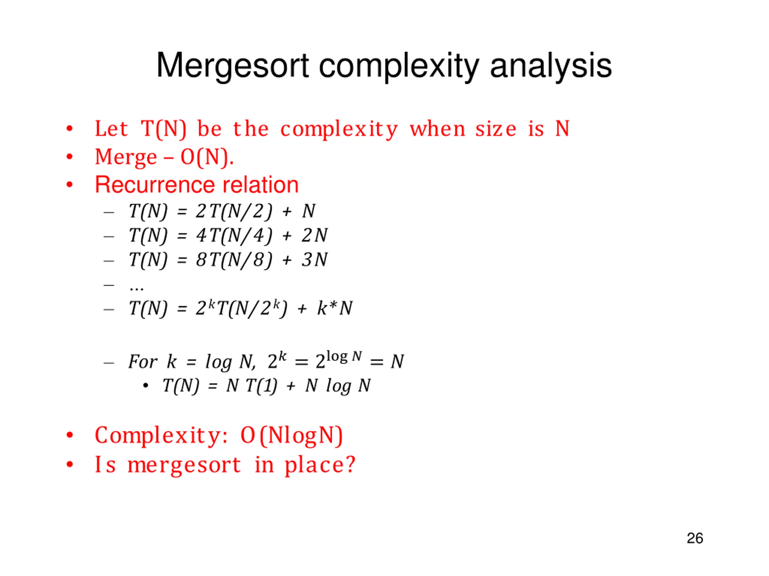 Mergesort complexity analysis Let T(N) be the complexity when size is N Merge O(N). Recurrence relation T(N) = 2T(N/2) + N T(N) = 4T(N/4) + 2N T(N) = 8T(N/8) + 3N T(N) = 2kT(N/2k) + k*N For k = logN, 2?= 2log ?= ? T(N) = NT(1) + N logN Complexity: O(NlogN) Is mergesort in place? 26