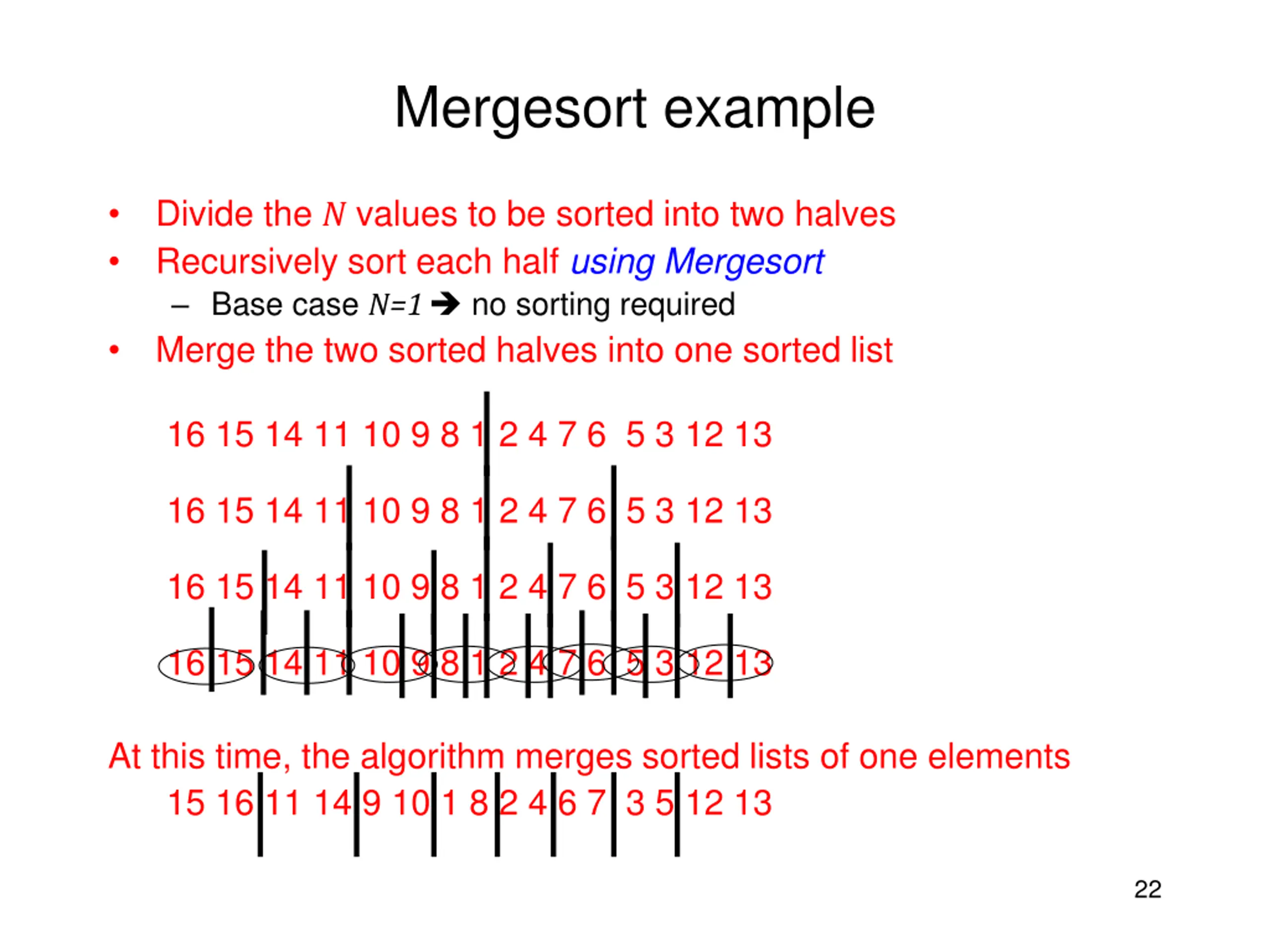 Mergesort example Divide the N values to be sorted into two halves Recursively sort each half using Mergesort Base case N=1 no sorting required Merge the two sorted halves into one sorted list 16 15 14 11 10 9 8 1 2 4 7 6 5 3 12 13 16 15 14 11 10 9 8 1 2 4 7 6 5 3 12 13 16 15 14 11 10 9 8 1 2 4 7 6 5 3 12 13 16 15 14 11 10 9 8 1 2 4 7 6 5 3 12 13 At this time, the algorithm merges sorted lists of one elements 15 16 11 14 9 10 1 8 2 4 6 7 3 5 12 13 22