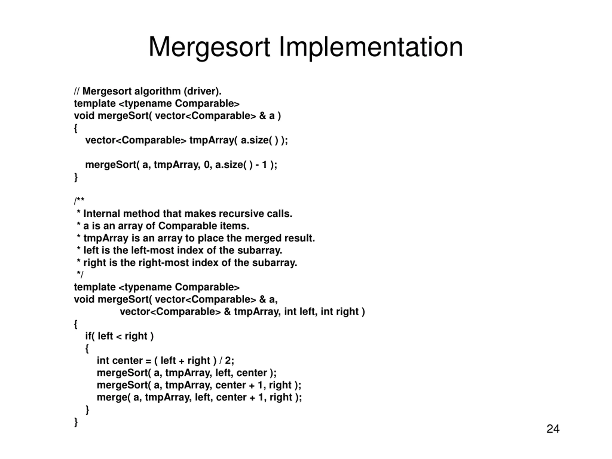 Mergesort Implementation // Mergesort algorithm (driver). template <typename Comparable> void mergeSort( vector<Comparable> & a ) { vector<Comparable> tmpArray( a.size( ) ); mergeSort( a, tmpArray, 0, a.size( ) - 1 ); } /** * Internal method that makes recursive calls. * a is an array of Comparable items. * tmpArray is an array to place the merged result. * left is the left-most index of the subarray. * right is the right-most index of the subarray. */ template <typename Comparable> void mergeSort( vector<Comparable> & a, vector<Comparable> & tmpArray, int left, int right ) { if( left < right ) { int center = ( left + right ) / 2; mergeSort( a, tmpArray, left, center ); mergeSort( a, tmpArray, center + 1, right ); merge( a, tmpArray, left, center + 1, right ); } } 24