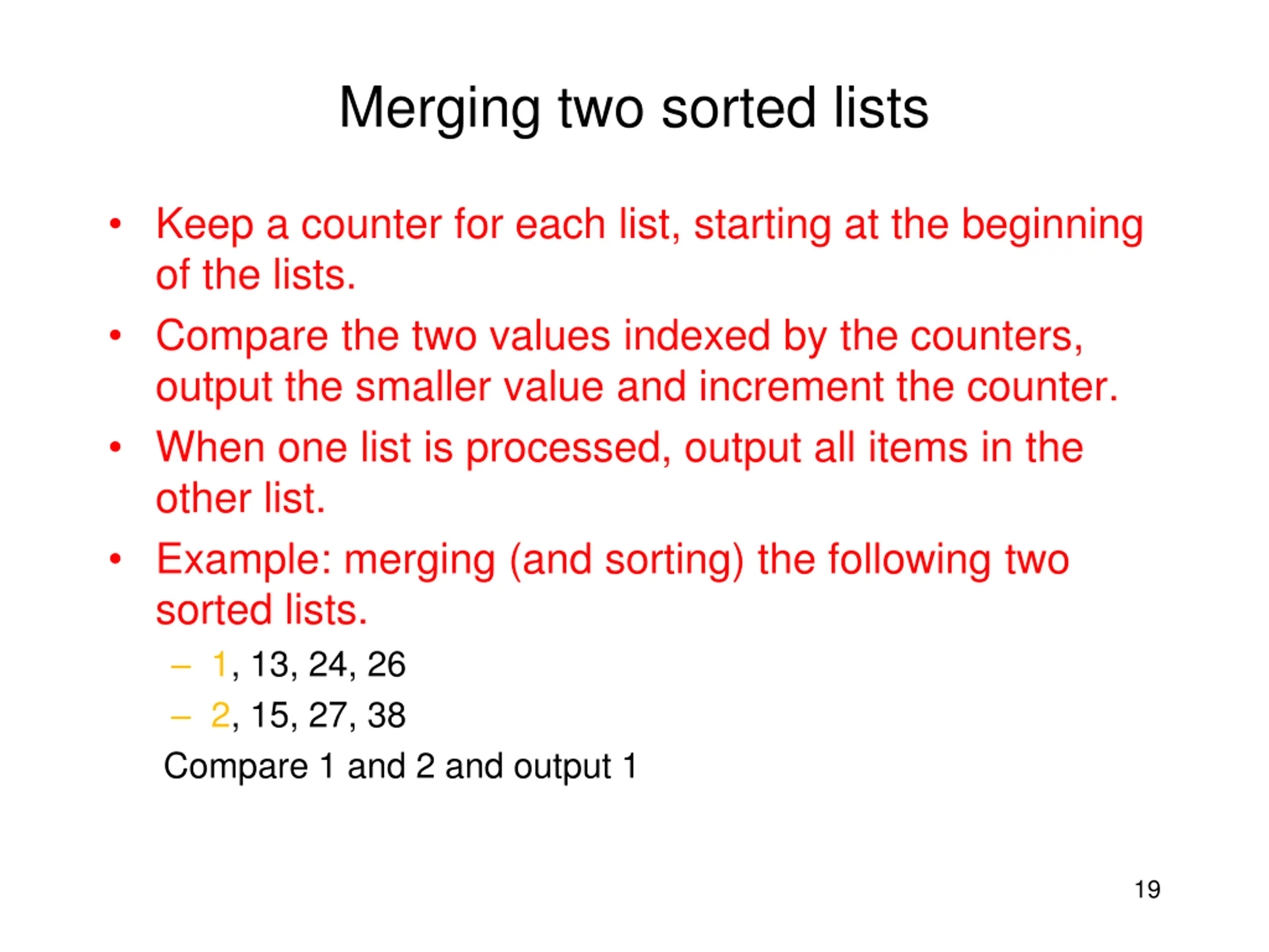 Merging two sorted lists Keep a counter for each list, starting at the beginning of the lists. Compare the two values indexed by the counters, output the smaller value and increment the counter. When one list is processed, output all items in the other list. Example: merging (and sorting) the following two sorted lists. 1, 13, 24, 26 2, 15, 27, 38 Compare 1 and 2 and output 1 19