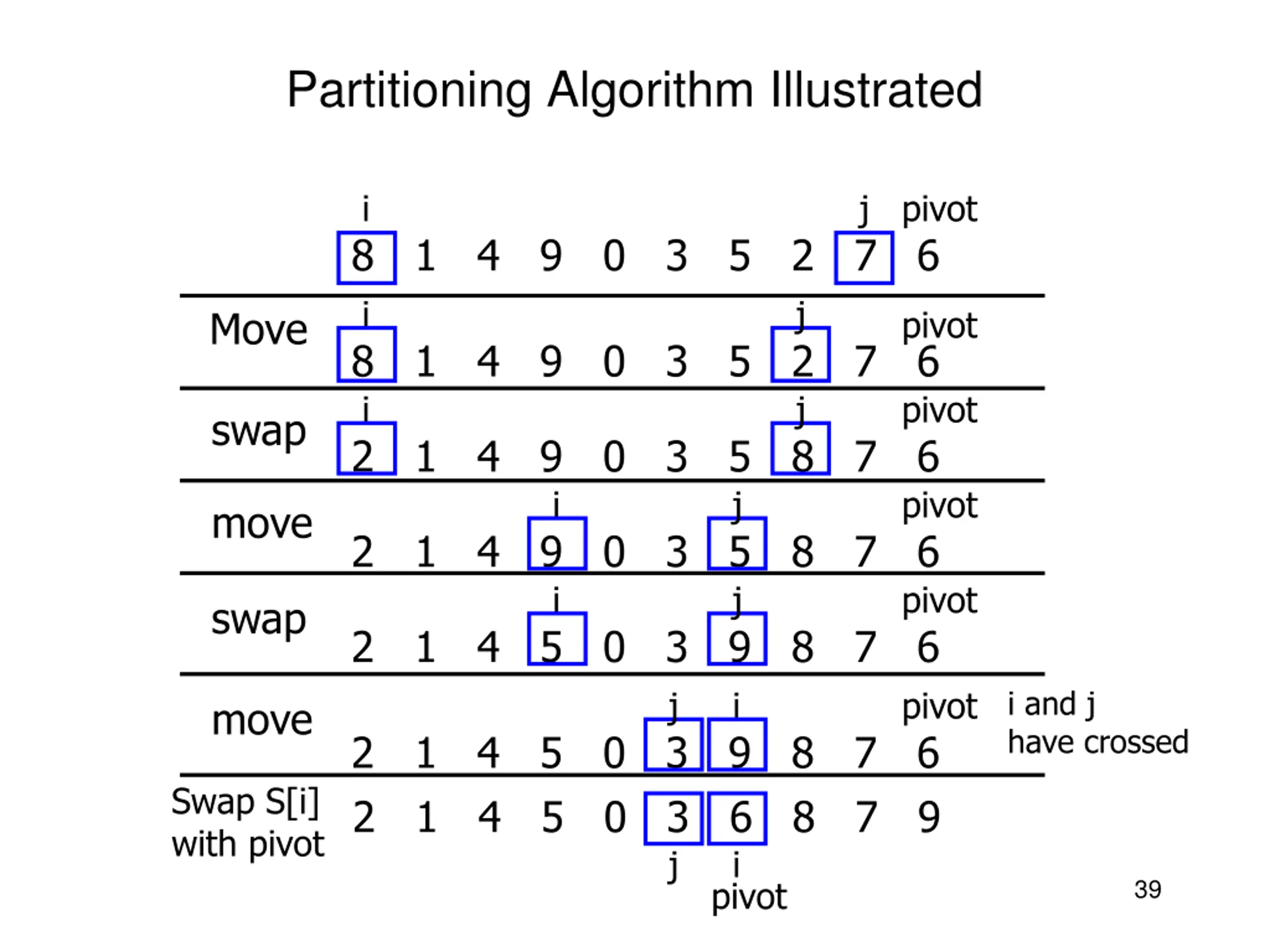 Partitioning Algorithm (contd.) While (i < j) Move i to the right till we find a number greater than pivot Move j to the left till we find a number smaller than pivot If (i < j)swap(S[i], S[j]) (The effect is to push larger elements to the right and smaller elements to the left) 4. Swap the pivot with S[i] 38