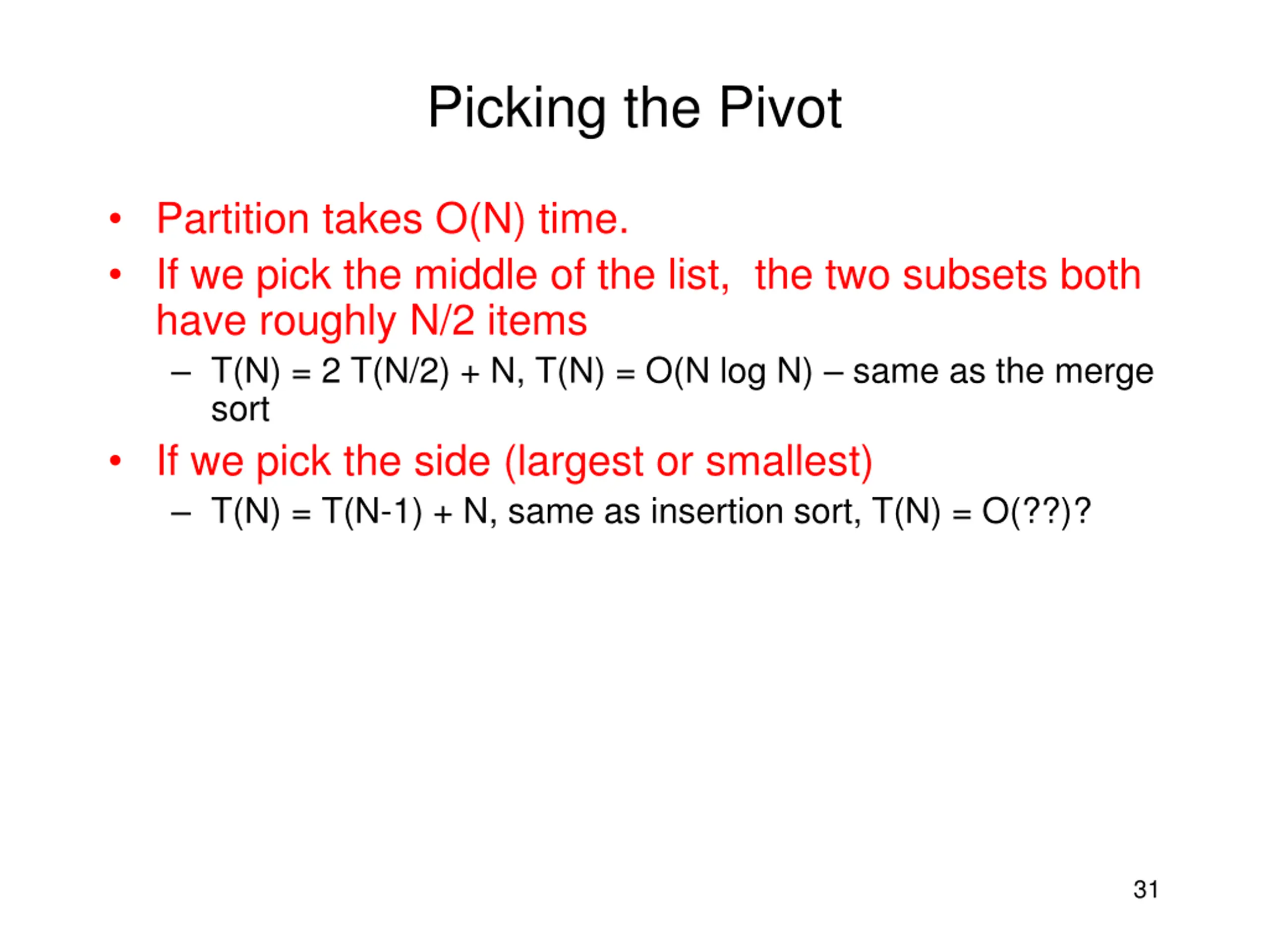 Picking the Pivot Partition takes O(N) time. If we pick the middle of the list, the two subsets both have roughly N/2 items T(N) = 2 T(N/2) + N, T(N) = O(N log N) same as the merge sort If we pick the side (largest or smallest) T(N) = T(N-1) + N, same as insertion sort, T(N) = O(??)? 31