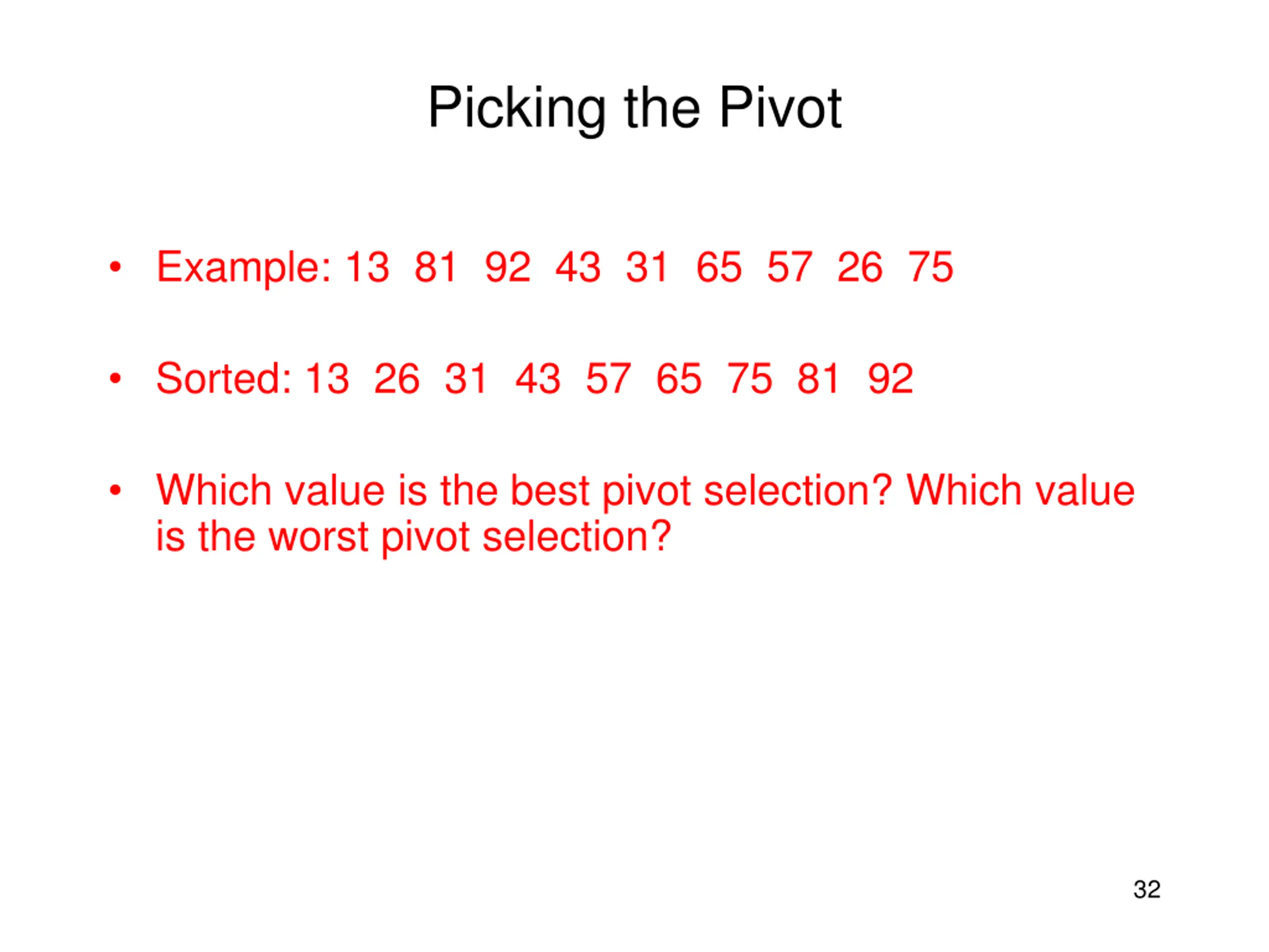 Picking the Pivot Example: 13 81 92 43 31 65 57 26 75 Sorted: 13 26 31 43 57 65 75 81 92 Which value is the best pivot selection? Which value is the worst pivot selection? 32