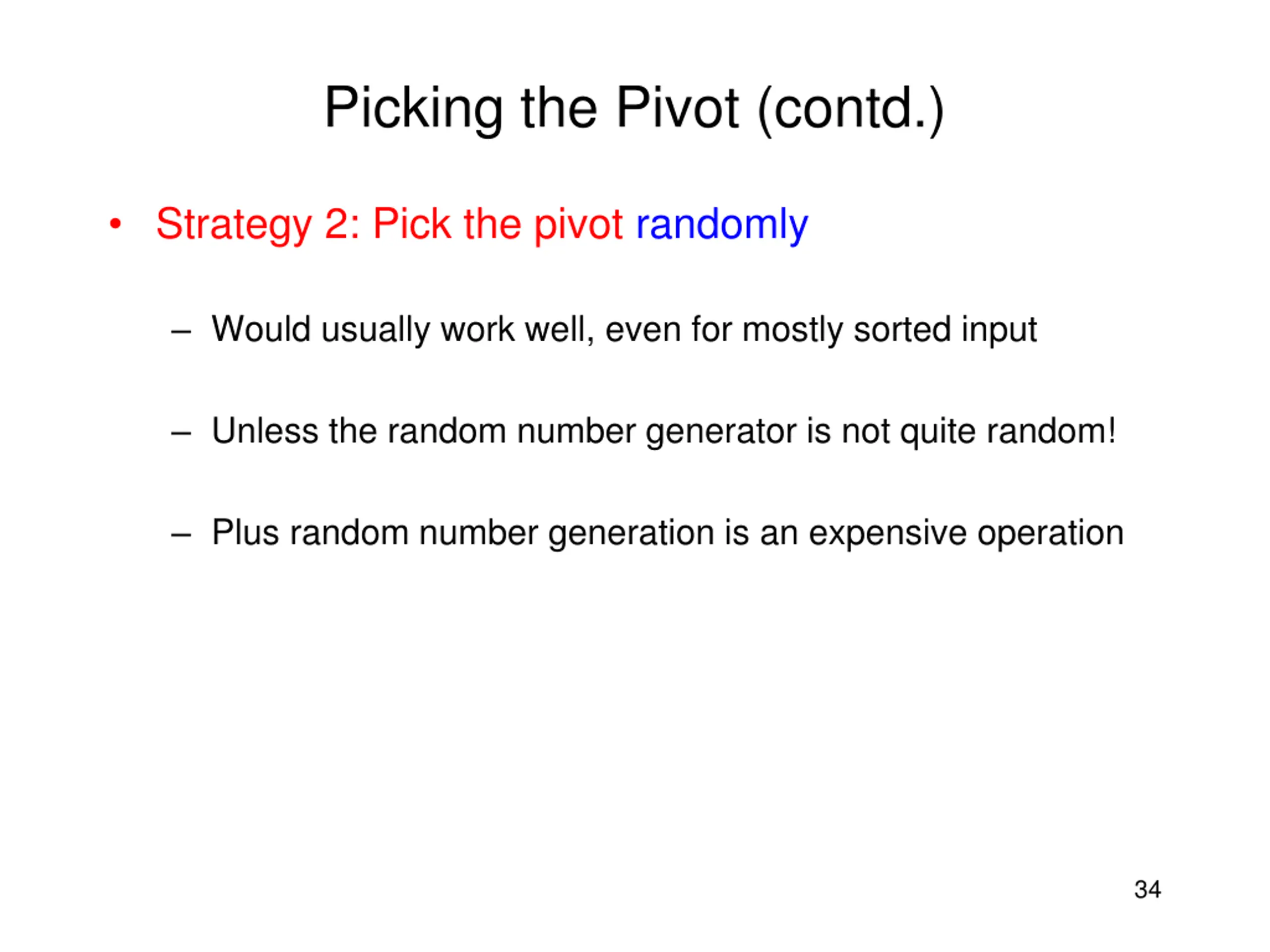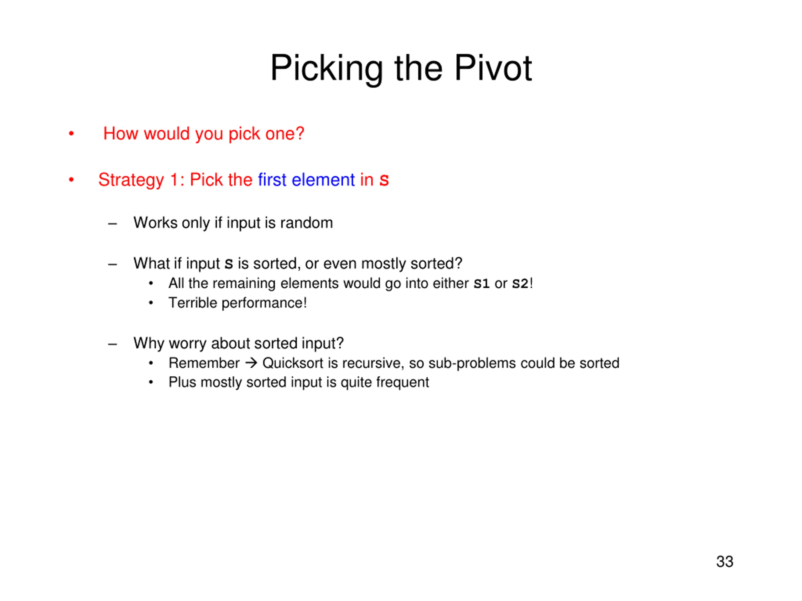 Picking the Pivot How would you pick one? Strategy 1: Pick the first element in S Works only if input is random What if input S is sorted, or even mostly sorted? All the remaining elements would go into either S1 or S2! Terrible performance! Why worry about sorted input? Remember Quicksort is recursive, so sub-problems could be sorted Plus mostly sorted input is quite frequent 33