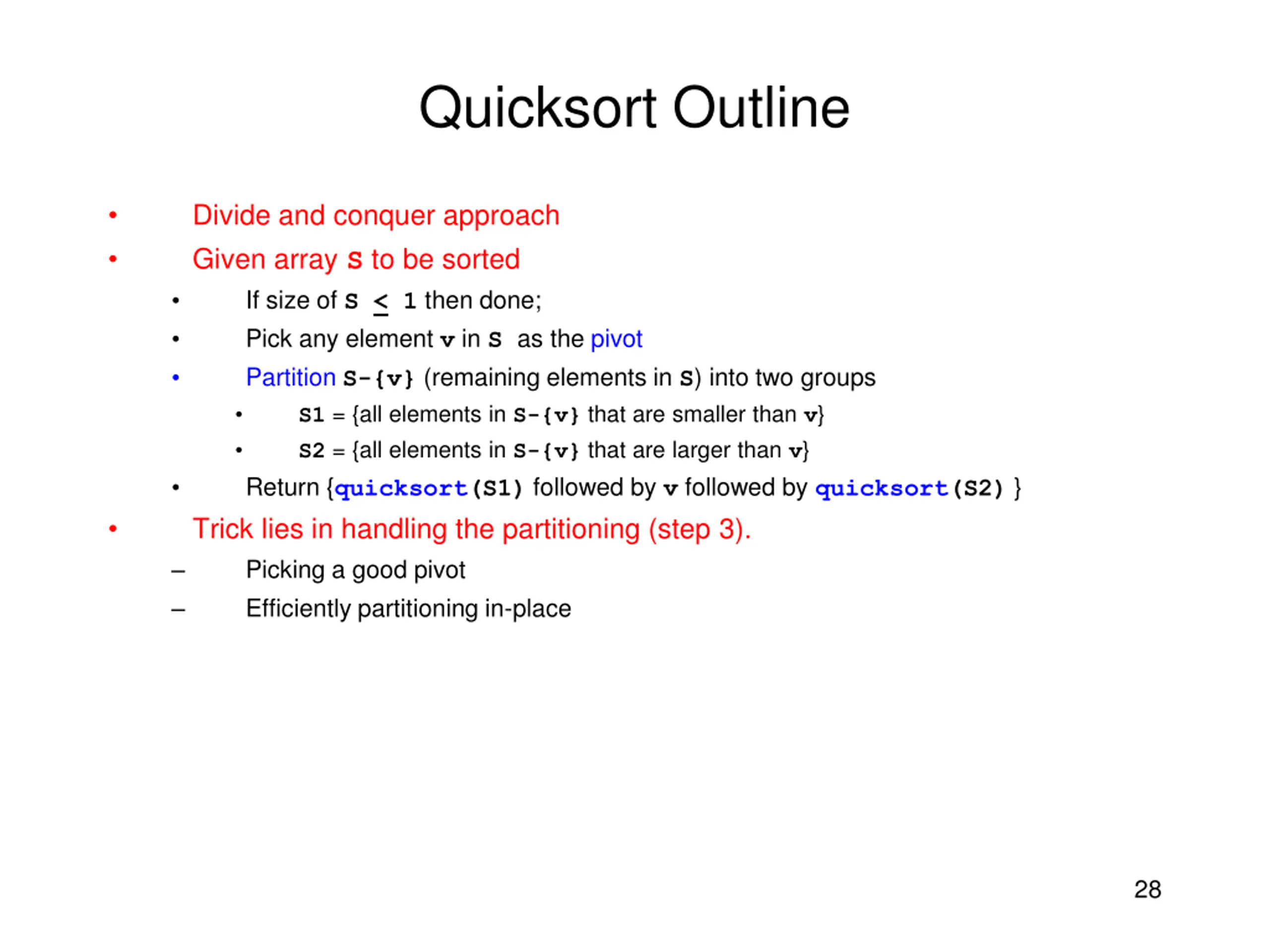 Quicksort Outline Divide and conquer approach Given array S to be sorted If size of S < 1 then done; Pick any element v in S as the pivot Partition S-{v} (remaining elements in S) into two groups S1 = {all elements in S-{v} that are smaller than v} S2 = {all elements in S-{v} that are larger than v} Return {quicksort(S1) followed by v followed by quicksort(S2) } Trick lies in handling the partitioning (step 3). Picking a good pivot Efficiently partitioning in-place 28