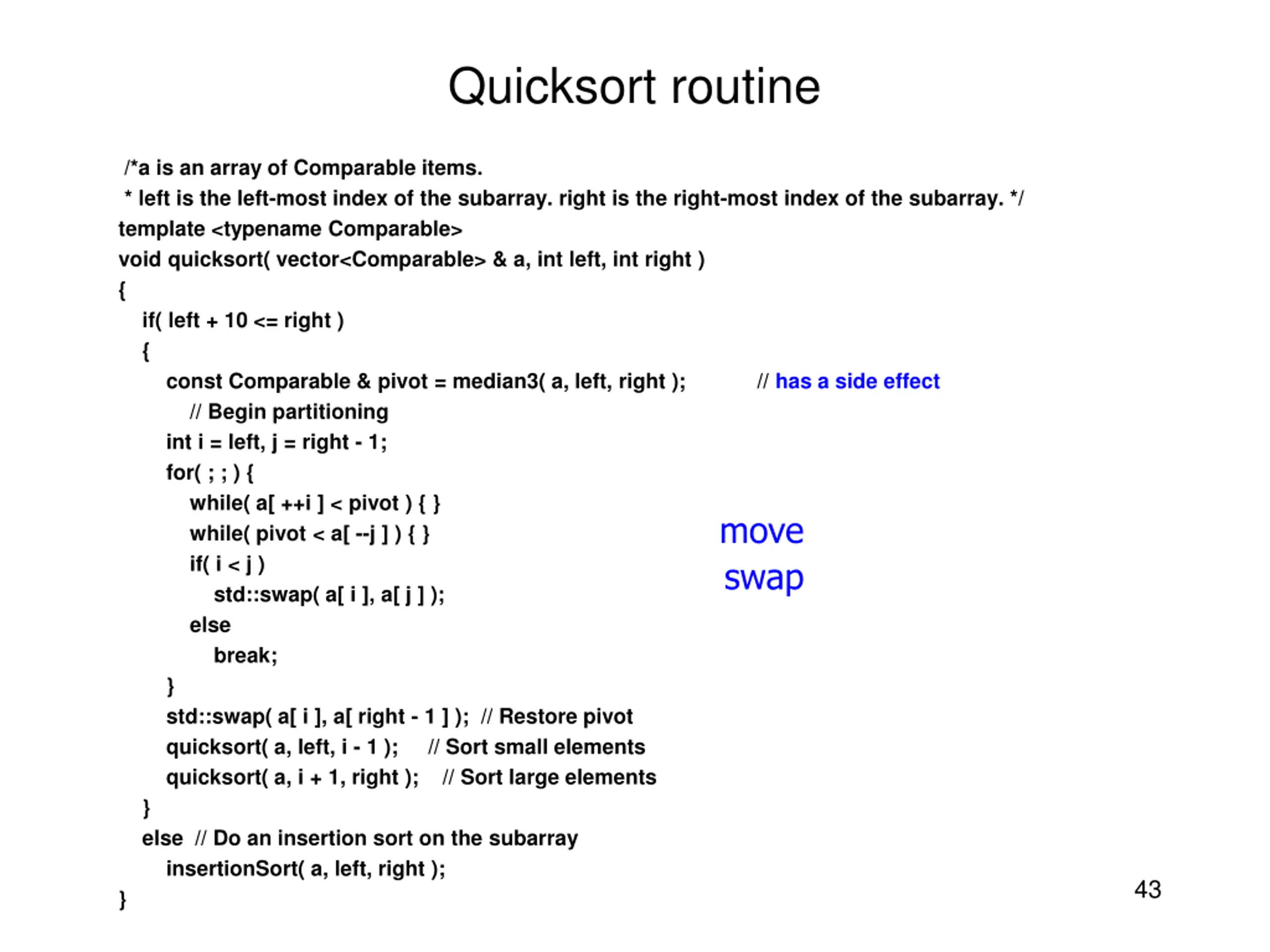 Quicksort routine /*a is an array of Comparable items. * left is the left-most index of the subarray. right is the right-most index of the subarray. */ template <typename Comparable> void quicksort( vector<Comparable> & a, int left, int right ) { if( left + 10 <= right ) { const Comparable & pivot = median3( a, left, right ); // has a side effect // Begin partitioning int i = left, j = right - 1; for( ; ; ) { while( a[ ++i ] < pivot ) { } while( pivot < a[ --j ] ) { } if( i < j ) std::swap( a[ i ], a[ j ] ); else break; } std::swap( a[ i ], a[ right - 1 ] ); // Restore pivot quicksort( a, left, i - 1 ); // Sort small elements quicksort( a, i + 1, right ); // Sort large elements } else // Do an insertion sort on the subarray insertionSort( a, left, right ); } move swap 43