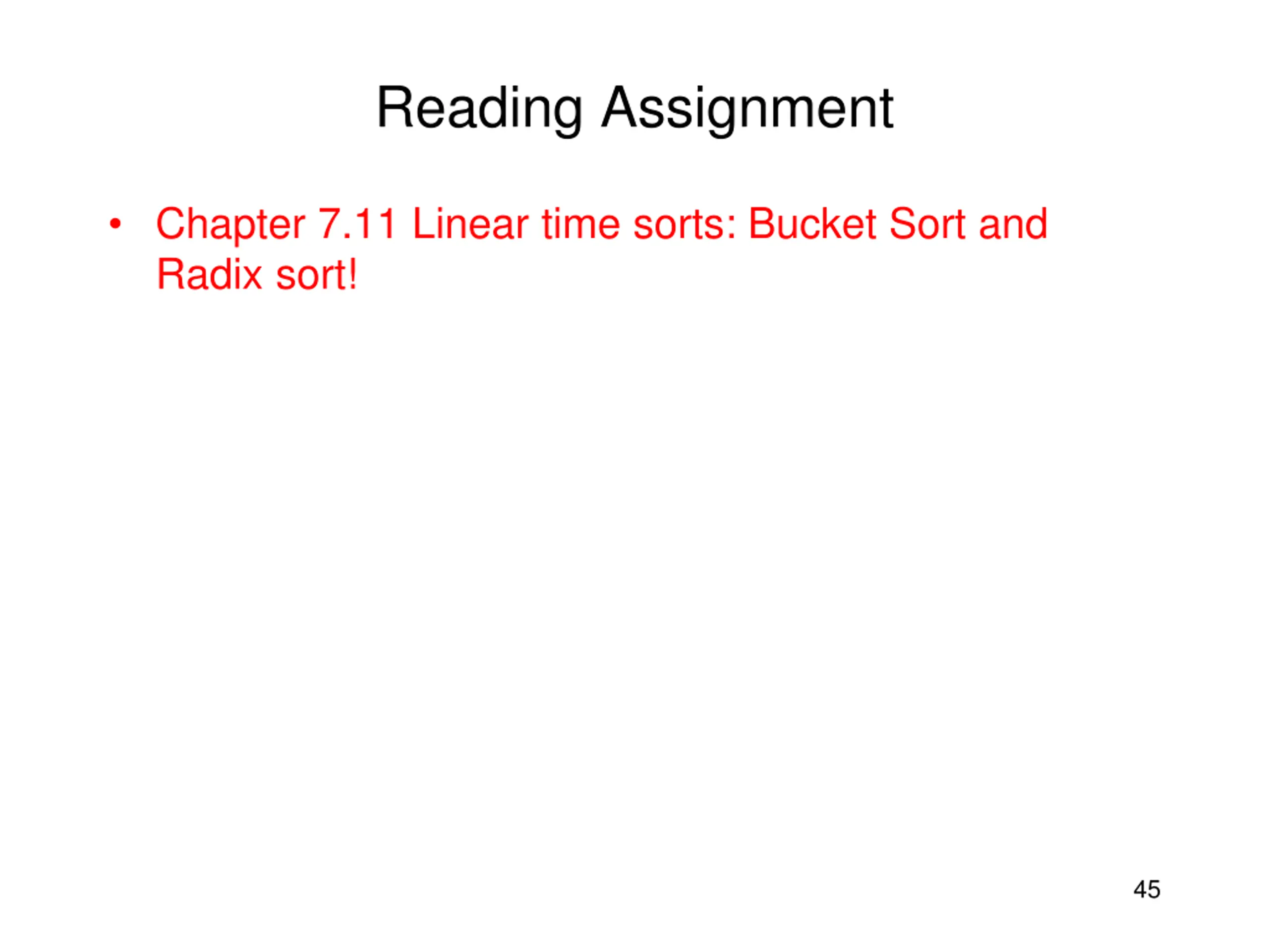 Reading Assignment Chapter 7.11 Linear time sorts: Bucket Sort and Radix sort! 45