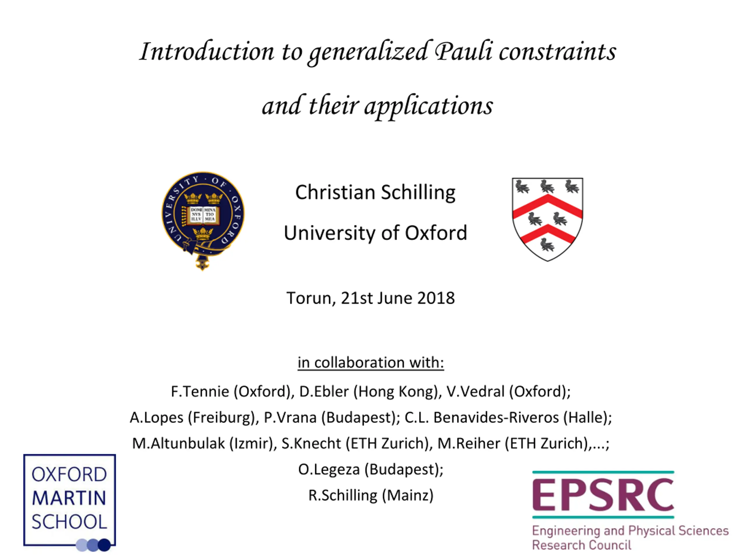 Introduction to generalized Pauli constraints and their applications Christian Schilling University of Oxford Torun, 21st June 2018 in collaboration with: F.Tennie (Oxford), D.Ebler (Hong Kong), V.Vedral (Oxford); A.Lopes (Freiburg), P.Vrana (Budapest); C.L. Benavides-Riveros (Halle); M.Altunbulak (Izmir), S.Knecht (ETH Zurich), M.Reiher (ETH Zurich),...; O.Legeza (Budapest); R.Schilling (Mainz)