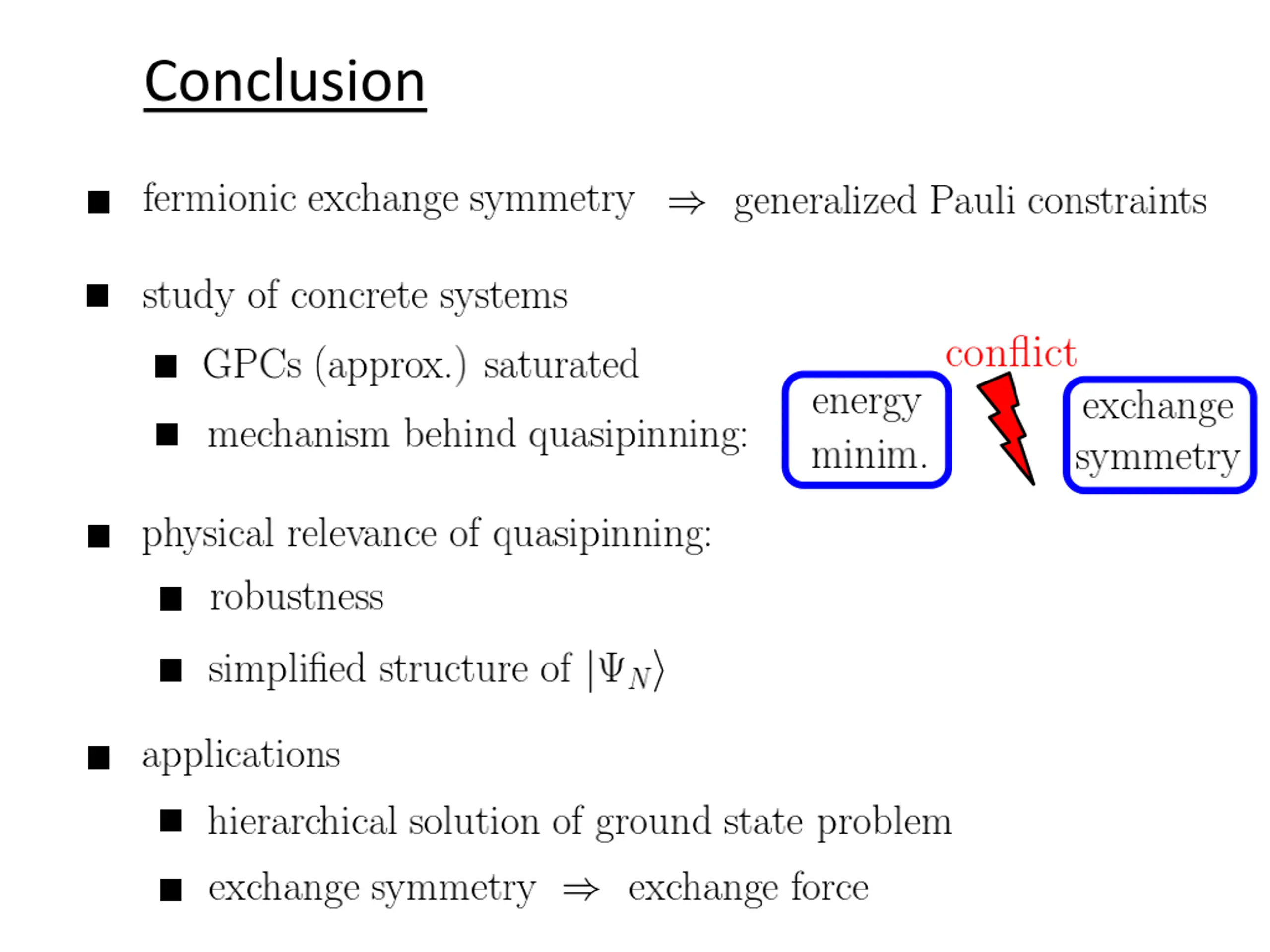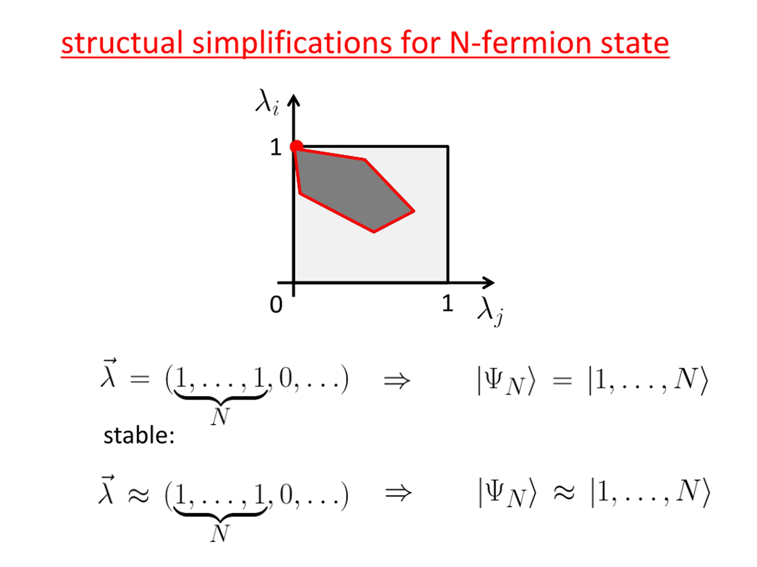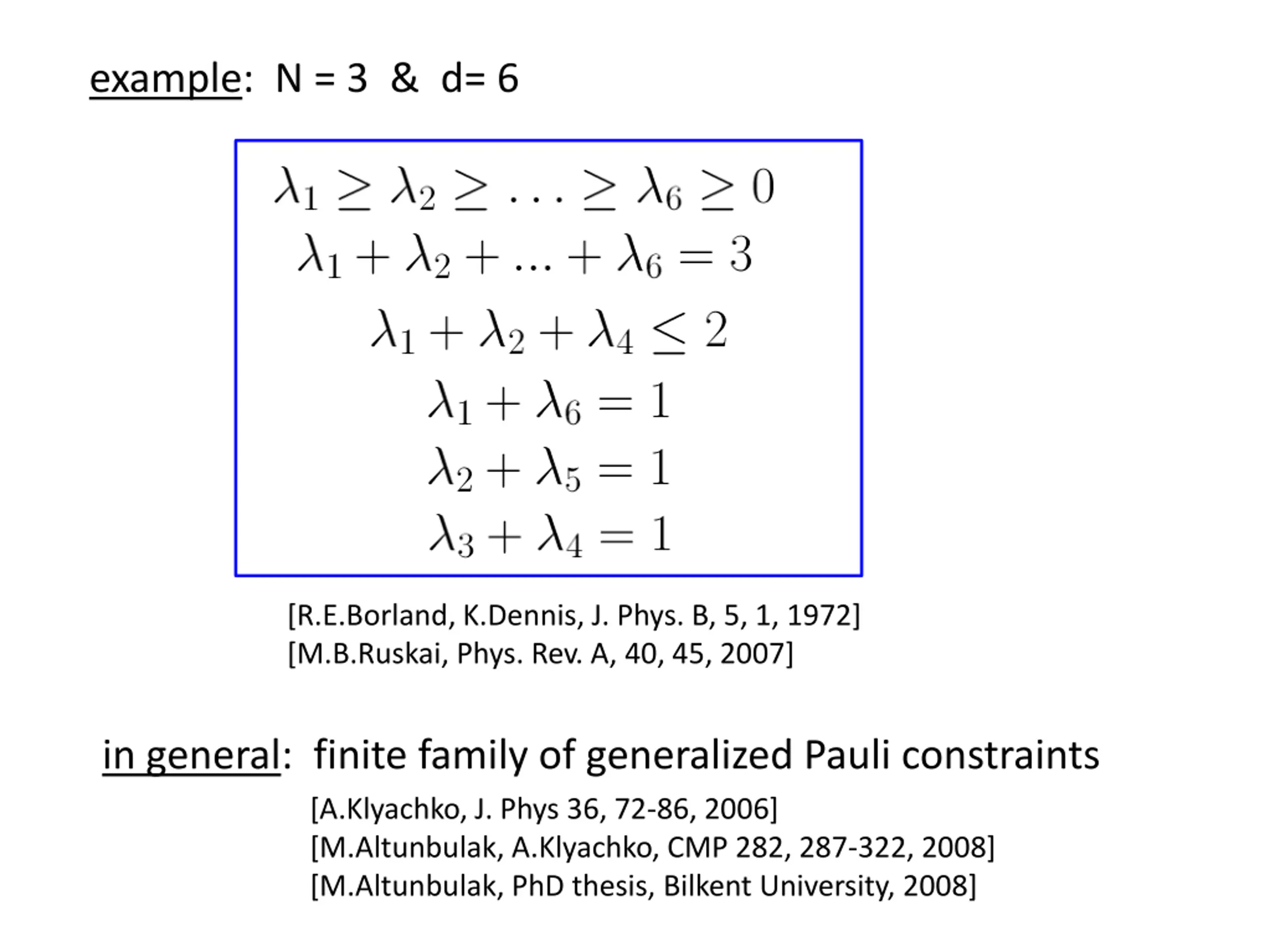 example: N = 3 & d= 6 [R.E.Borland, K.Dennis, J. Phys. B, 5, 1, 1972] [M.B.Ruskai, Phys. Rev. A, 40, 45, 2007] in general: finite family of generalized Pauli constraints [A.Klyachko, J. Phys 36, 72-86, 2006] [M.Altunbulak, A.Klyachko, CMP 282, 287-322, 2008] [M.Altunbulak, PhD thesis, Bilkent University, 2008]