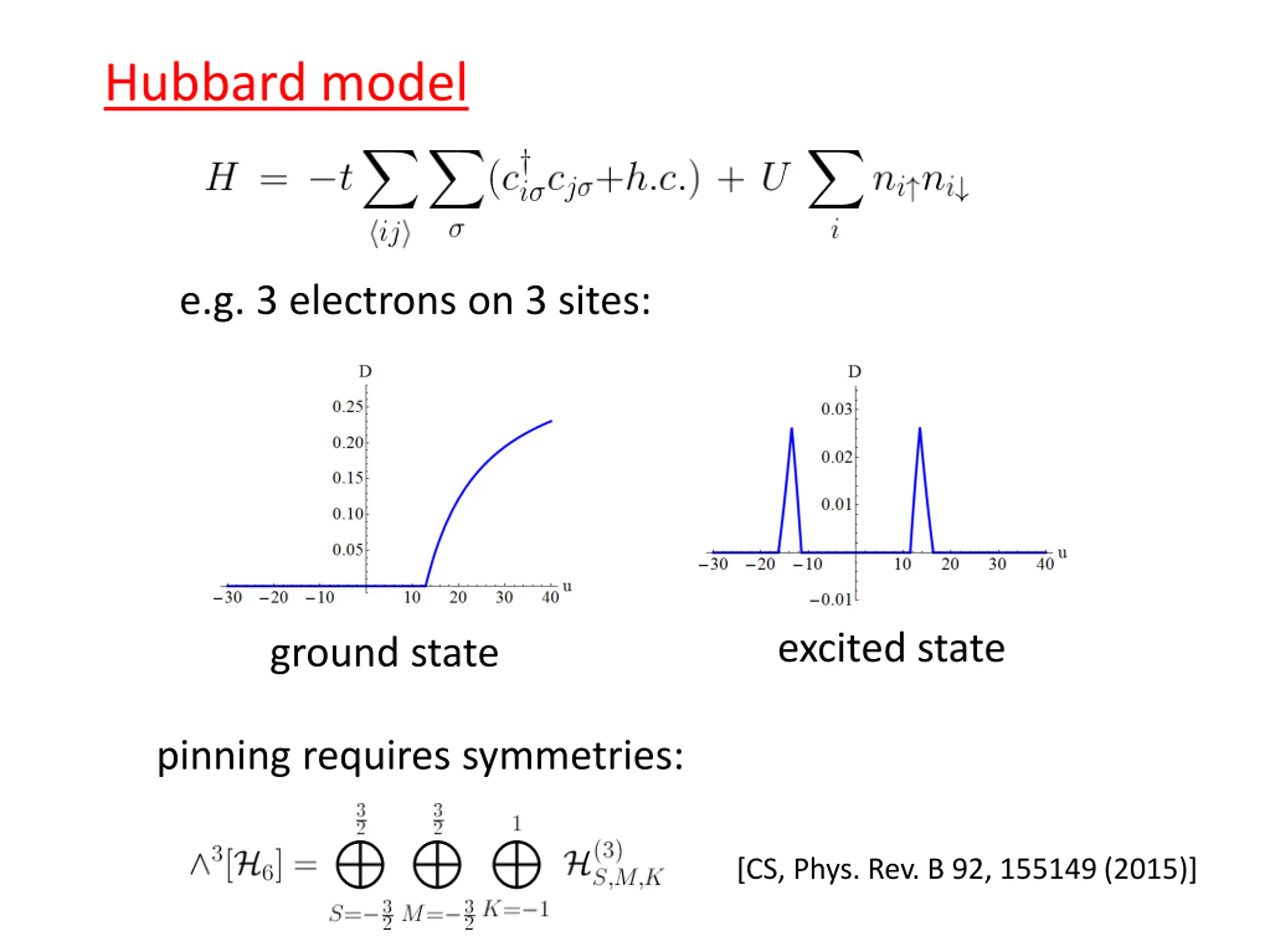 Hubbard model e.g. 3 electrons on 3 sites: excited state ground state pinning requires symmetries: [CS, Phys. Rev. B 92, 155149 (2015)]