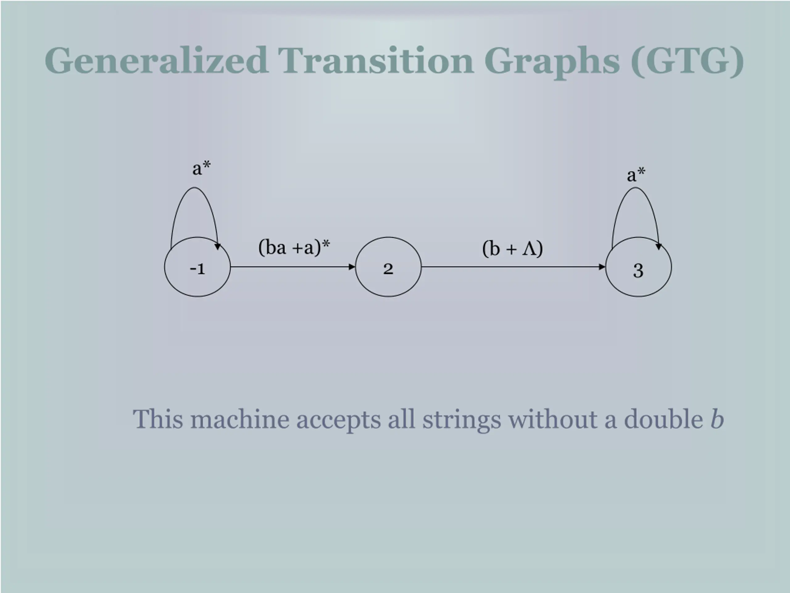 Generalized Transition Graphs (GTG) a* a* (ba +a)* (b + ) -1 2 3 This machine accepts all strings without a double b
