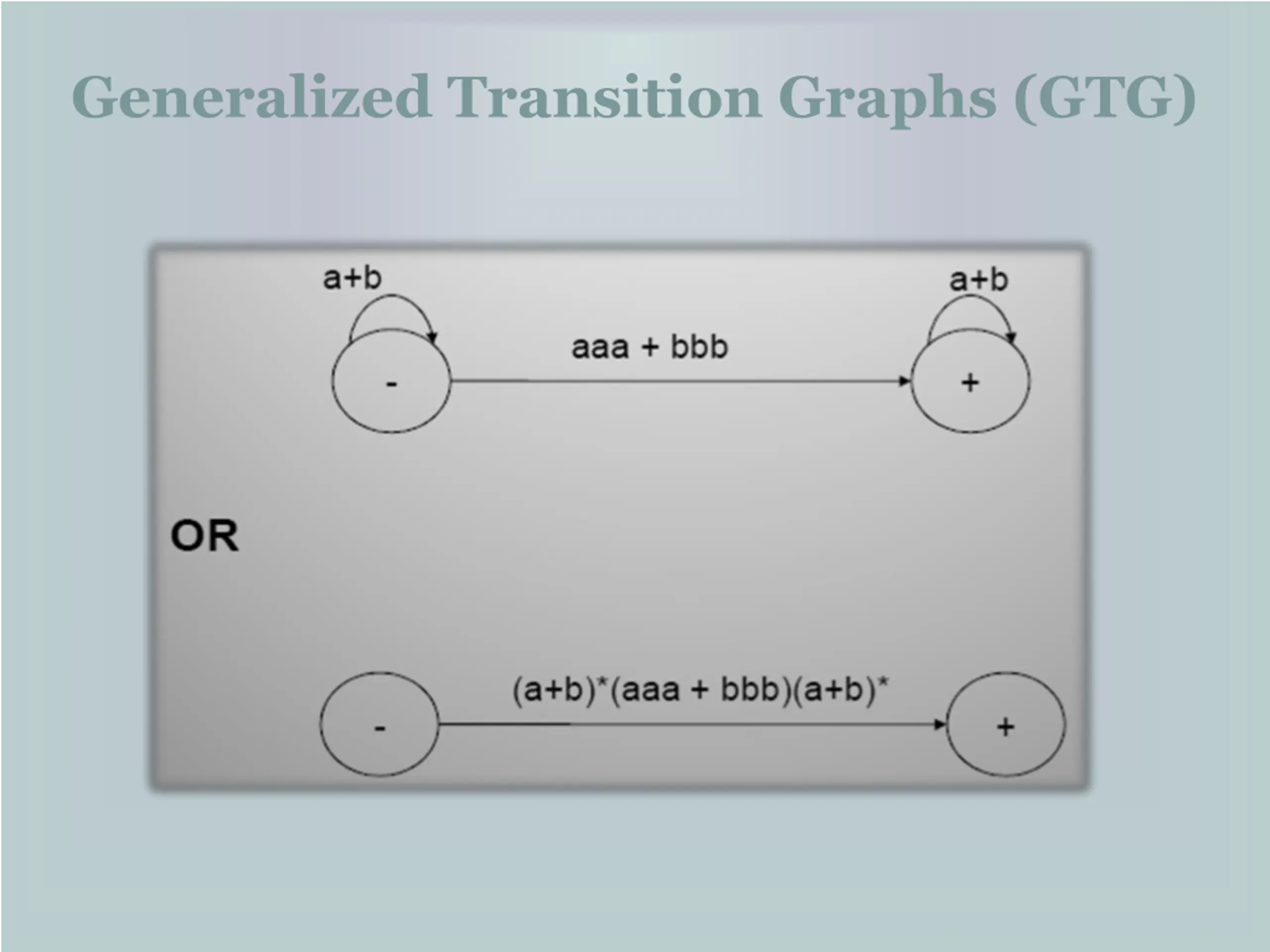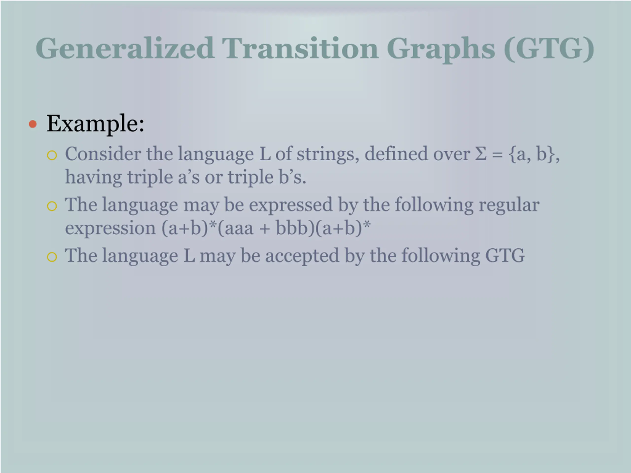 Generalized Transition Graphs (GTG) Example: Consider the language L of strings, defined over = {a, b}, having triple a s or triple b s. The language may be expressed by the following regular expression (a+b)*(aaa + bbb)(a+b)* The language L may be accepted by the following GTG