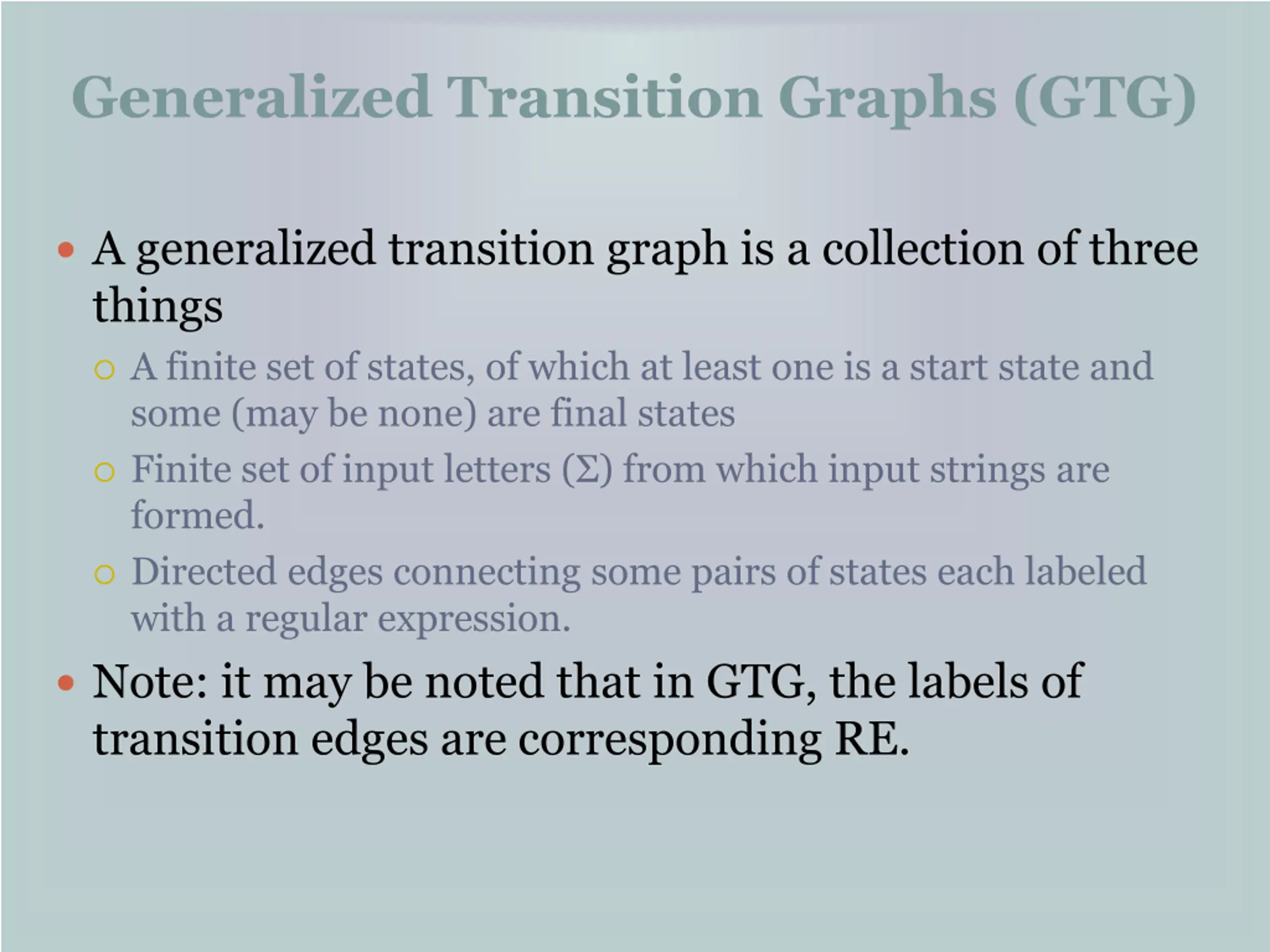 Generalized Transition Graphs (GTG) A generalized transition graph is a collection of three things A finite set of states, of which at least one is a start state and some (may be none) are final states Finite set of input letters ( ) from which input strings are formed. Directed edges connecting some pairs of states each labeled with a regular expression. Note: it may be noted that in GTG, the labels of transition edges are corresponding RE.