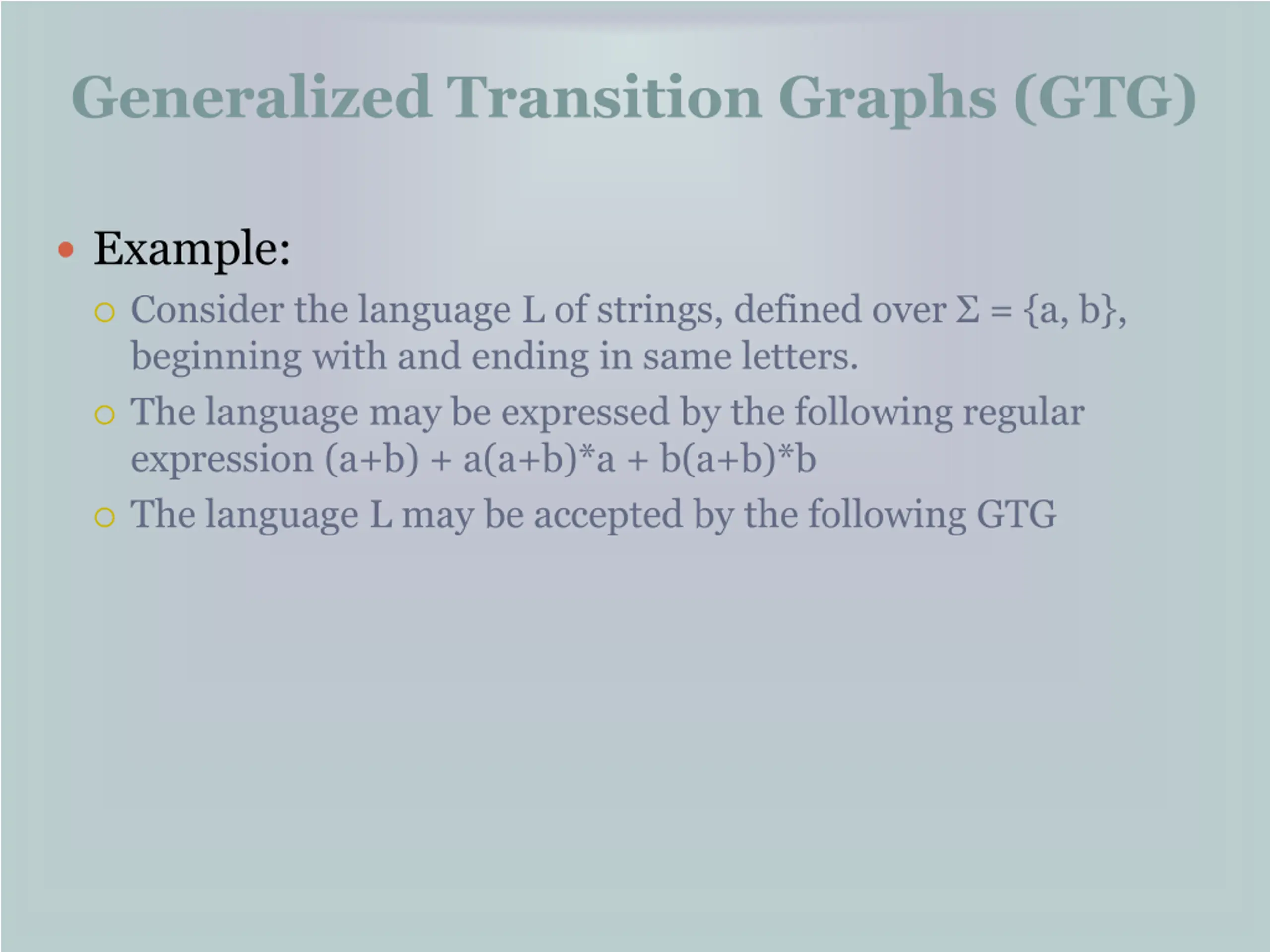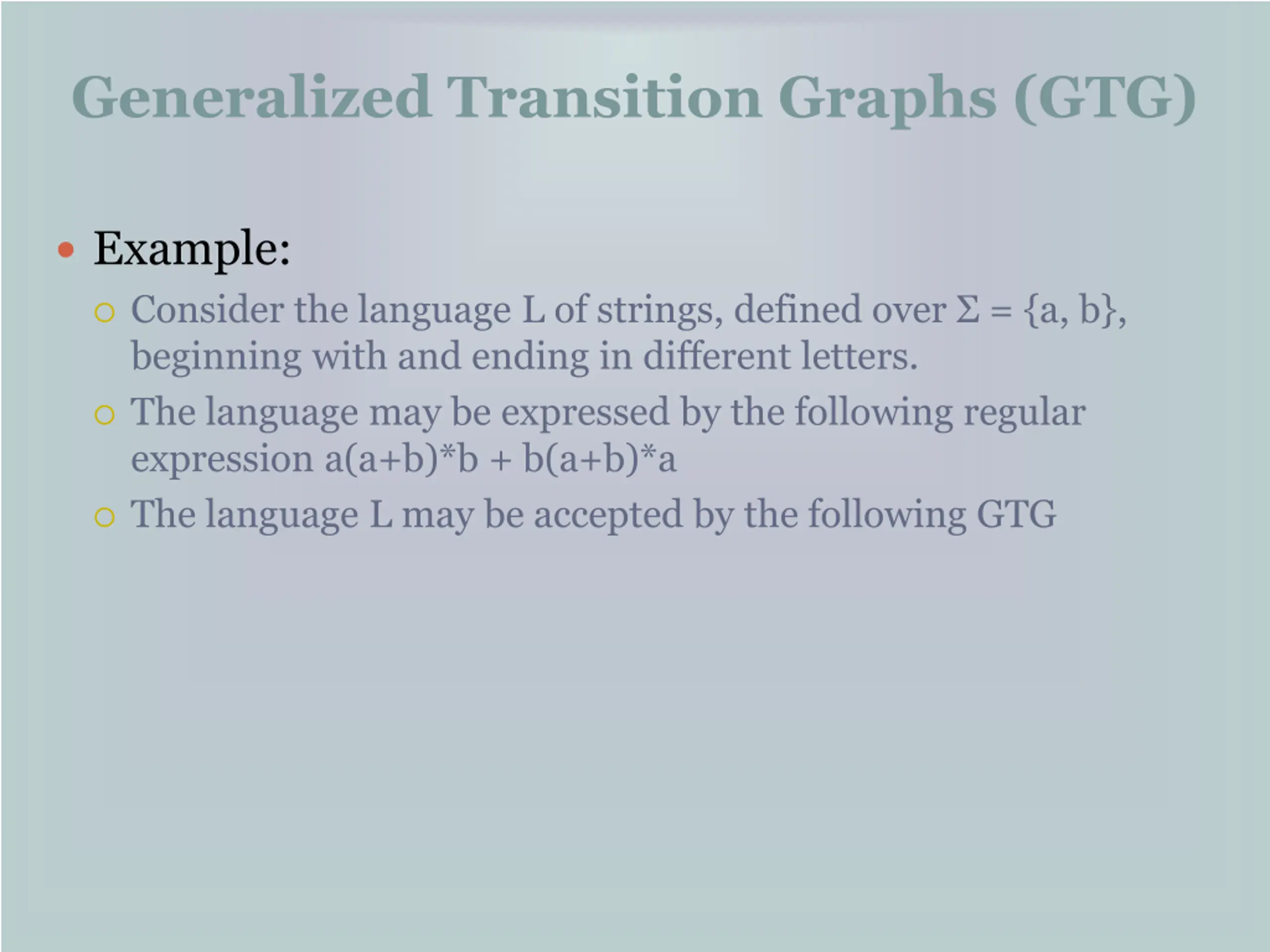 Generalized Transition Graphs (GTG) Example: Consider the language L of strings, defined over = {a, b}, beginning with and ending in different letters. The language may be expressed by the following regular expression a(a+b)*b + b(a+b)*a The language L may be accepted by the following GTG