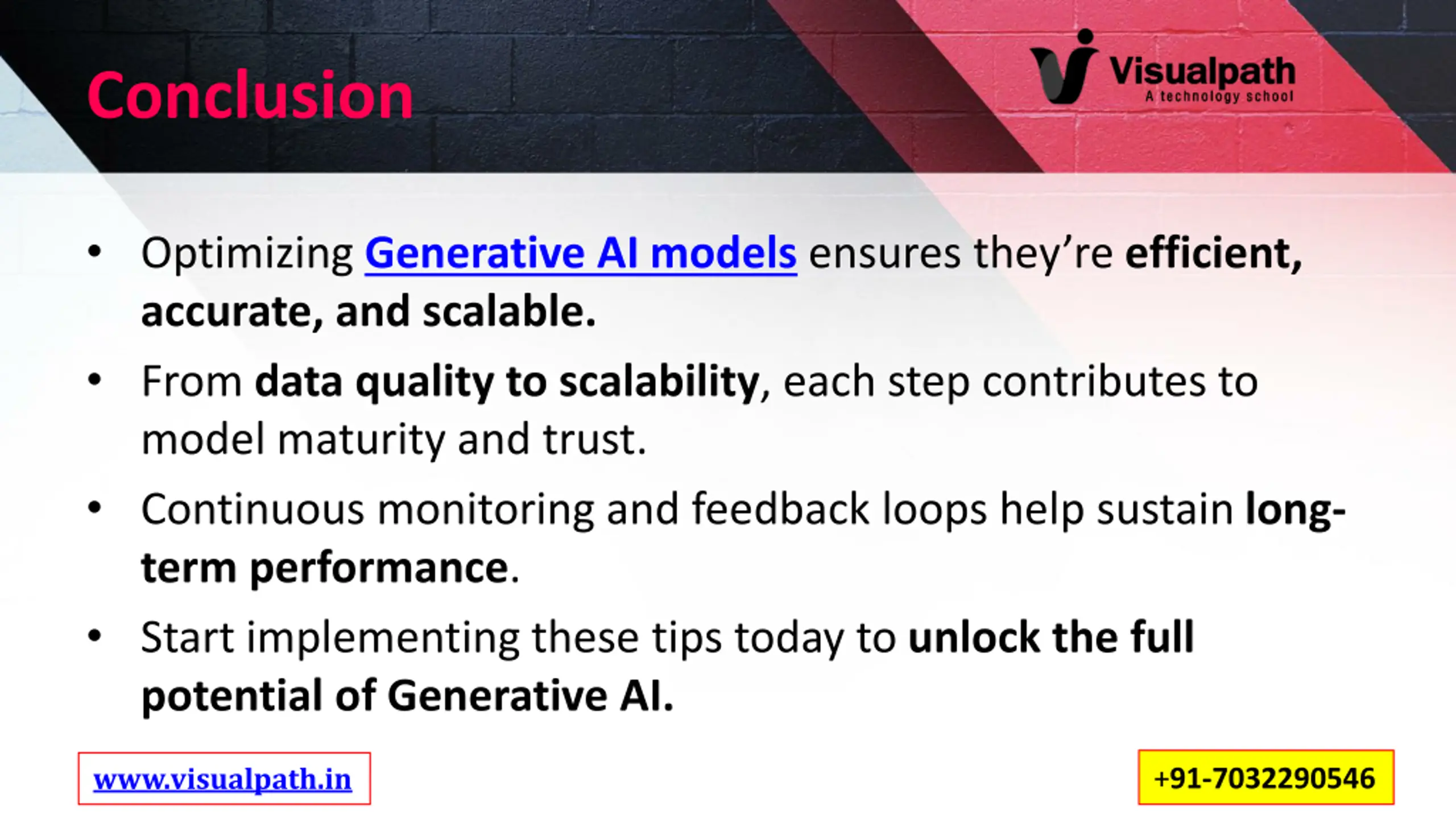 10. Conclusion Optimizing Generative AI modelsensures they re efficient, accurate, and scalable. From data quality to scalability, each step contributes to model maturity and trust. Continuous monitoring and feedback loops help sustain long- term performance. Start implementing these tips today to unlock the full potential of Generative AI. www.visualpath.in +91-7032290546