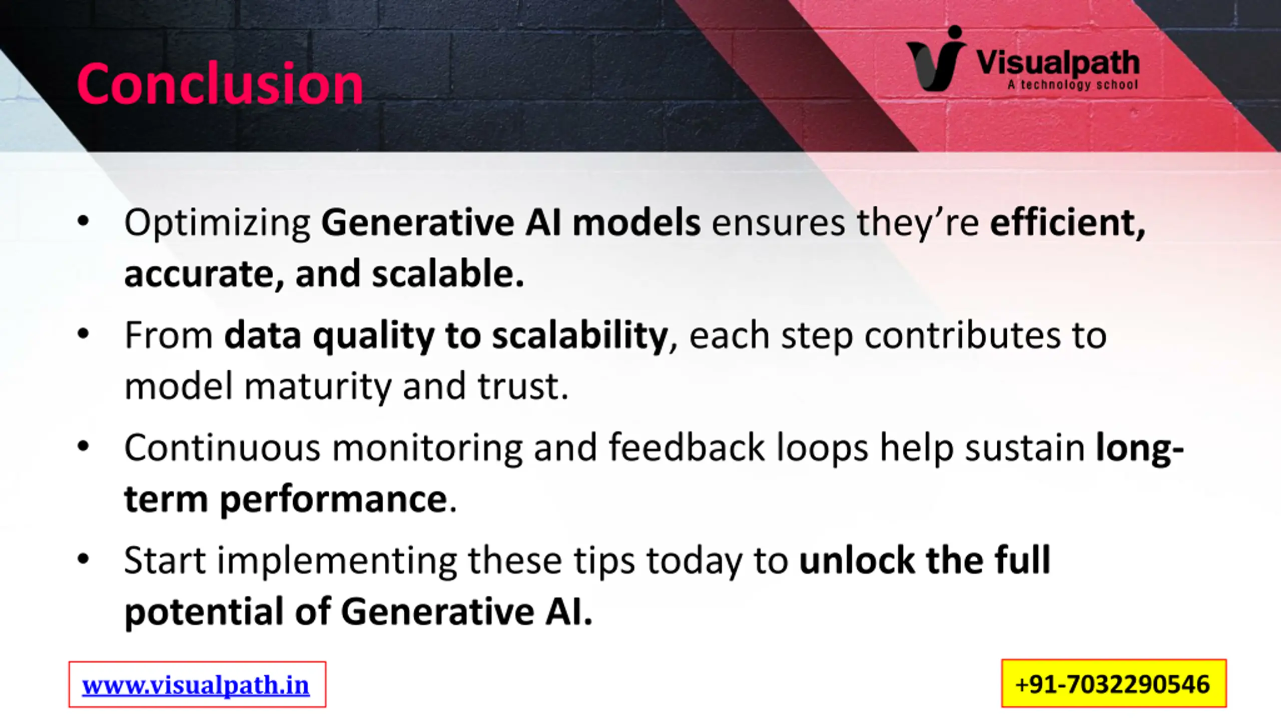 Conclusion Optimizing Generative AI modelsensures they re efficient, accurate, and scalable. From data quality to scalability, each step contributes to model maturity and trust. Continuous monitoring and feedback loops help sustain long- term performance. Start implementing these tips today to unlock the full potential of Generative AI. www.visualpath.in +91-7032290546