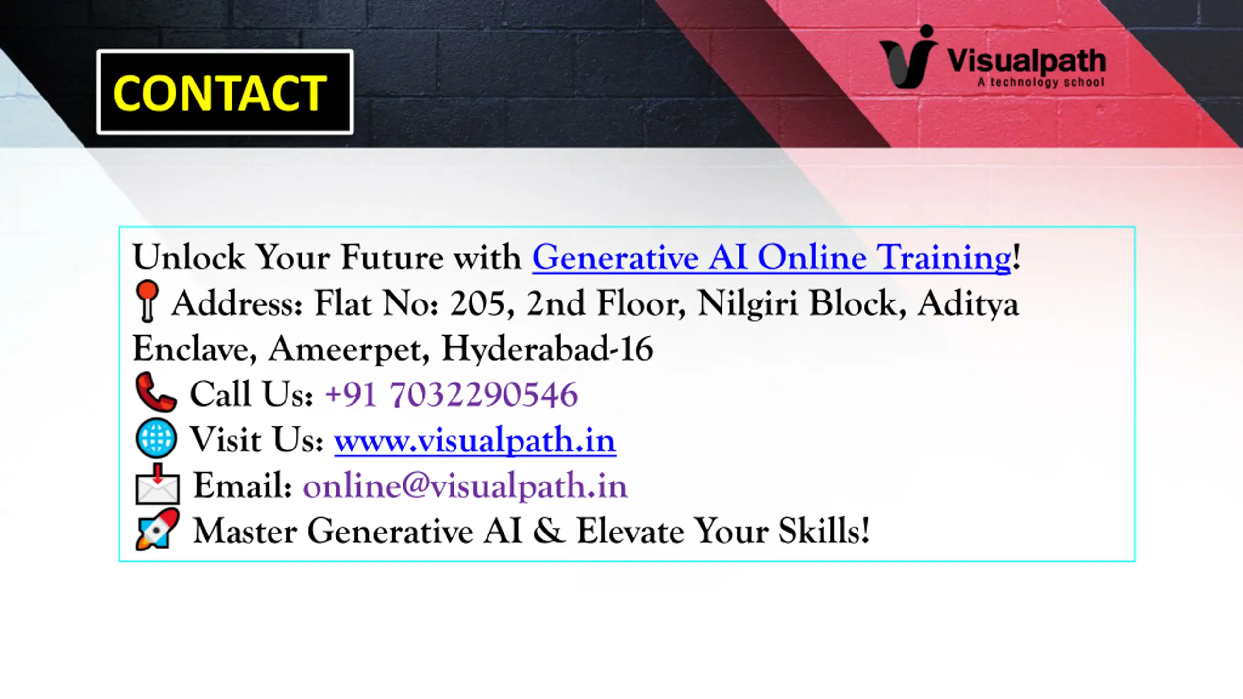 CONTACT Unlock Your Future with Generative AI Online Training! Address: Flat No: 205, 2nd Floor, Nilgiri Block, Aditya Enclave, Ameerpet, Hyderabad-16 Call Us: +91 7032290546 Visit Us: www.visualpath.in Email: online@visualpath.in Master Generative AI & Elevate Your Skills!