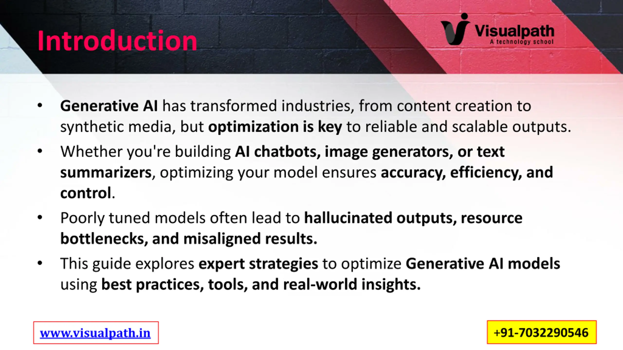 Introduction Generative AI has transformed industries, from content creation to synthetic media, but optimization is key to reliable and scalable outputs. Whether you're building AI chatbots, image generators, or text summarizers, optimizing your model ensures accuracy, efficiency, and control. Poorly tuned models often lead to hallucinated outputs, resource bottlenecks, and misaligned results. This guide explores expert strategies to optimize Generative AI models using best practices, tools, and real-world insights. www.visualpath.in +91-7032290546